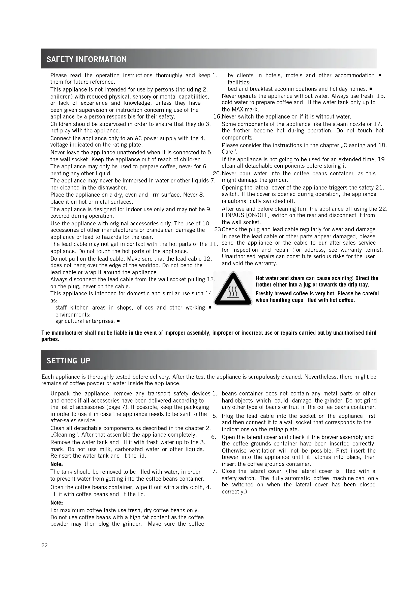 Meldung im Display alphabetisch English VORMAHLEN AUS Pregrind OFF WÄRMEPLATTE AUS Cup warmer OFF WÄRMEPLATTE EIN Cup warmer ON WASSER ABLASSEN Please release water WASSERTANK FÜLLEN Please add water ZWEI TASSEN Two cups of coffee MANUELLER TEST Manual testing TEST PUMPE Pump test BRÜHGRUPPE HOCHFAHREN Closewise motor test BRÜHGRUPPE HERUNTERFAH. Anti-closewise motor test TEST MAHLWERK Grind motor test TEST ELEKTROMAGNET Electromagnet test22 safety information Please read the operating instructions thoroughly and keep 1. them for future reference. This appliance is not intended for use by persons (including 2. children) with reduced physical, sensory or mental capabilities, or lack of experience and knowledge, unless they have been given supervision or instruction concerning use of the appliance by a person responsible for their safety. Children should be supervised in order to ensure that they do 3. not play with the appliance. Connect the appliance only to an AC power supply with the 4. voltage indicated on the rating plate. Never leave the appliance unattended when it is connected to 5. the wall socket. Keep the appliance out of reach of children. The appliance may only be used to prepare coffee, never for 6. heating any other liquid. The appliance may never be immersed in water or other liquids 7. nor cleaned in the dishwasher. Place the appliance on a dry, even and firm surface. Never 8. place it on hot or metal surfaces. The appliance is designed for indoor use only and may not be 9. covered during operation. Use the appliance with original accessories only. The use of 10. accessories of other manufacturers or brands can damage the appliance or lead to hazards for the user. The lead cable may not get in contact with the hot parts of the 11. appliance. Do not touch the hot parts of the appliance. Do not pull on the lead cable. Make sure that the lead cable 12. does not hang over the edge of the worktop. Do not bend the lead cable or wrap it around the appliance. Always disconnect the lead cable from the wall socket pulling 13. on the plug, never on the cable. This appliance is intended for domestic and similar use such 14. as: staff kitchen areas in shops, offices and other working environments; agricultural enterprises; by clients in hotels, motels and other accommodation facilities; bed and breakfast accommodations and holiday homes. Never operate the appliance without water. Always use fresh, 15. cold water to prepare coffee and fill the water tank only up to the MAX mark. Never switch the appliance on if it is without water.16. Some components of the appliance like the steam nozzle or 17. the frother become hot during operation. Do not touch hot components. Please consider the instructions in the chapter „Cleaning and 18. Care“. If the appliance is not going to be used for an extended time, 19. clean all detachable components before storing it. Never pour water into the coffee beans container, as this 20. might damage the grinder. Opening the lateral cover of the appliance triggers the safety 21. switch. If the cover is opened during operation, the appliance is automatically switched off. After use and before cleaning turn the appliance off using the 22. EIN/AUS [ON/OFF] switch on the rear and disconnect it from the wall socket. Check the plug and lead cable regularly for wear and damage. 23. In case the lead cable or other parts appear damaged, please send the appliance or the cable to our after-sales service for inspection and repair (for address, see warranty terms). Unauthorised repairs can constitute serious risks for the user and void the warranty. Hot water and steam can cause scalding! Direct the frother either into a jug or towards the drip tray. Freshly brewed coffee is very hot. Please be careful when handling cups filled with hot coffee. The manufacturer shall not be liable in the event of improper assembly, improper or incorrect use or repairs carried out by unauthorised third parties. setting uP Each appliance is thoroughly tested before delivery. After the test the appliance is scrupulously cleaned. Nevertheless, there might be remains of coffee powder or water inside the appliance. Unpack the appliance, remove any transport safety devices 1. and check if all accessories have been delivered according to the list of accessories (page 7). If possible, keep the packaging in order to use it in case the appliance needs to be sent to the after-sales service. Clean all detachable components as described in the chapter 2. „Cleaning“. After that assemble the appliance completely. Remove the water tank and fill it with fresh water up to the 3. mark. Do not use milk, carbonated water or other liquids. Reinsert the water tank and fit the lid. Note: The tank should be removed to be filled with water, in order to prevent water from getting into the coffee beans container. Open the coffee beans container, wipe it out with a dry cloth, 4. fill it with coffee beans and fit the lid. Note: For maximum coffee taste use fresh, dry coffee beans only. Do not use coffee beans with a high fat content as the coffee powder may then clog the grinder. Make sure the coffee beans container does not contain any metal parts or other hard objects which could damage the grinder. Do not grind any other type of beans or fruit in the coffee beans container. Plug the lead cable into the socket on the appliance first 5. and then connect it to a wall socket that corresponds to the indications on the rating plate. Open the lateral cover and check if the brewer assembly and 6. the coffee grounds container have been inserted correctly. Otherwise ventilation will not be possible. First insert the brewer into the appliance until it latches into place, then insert the coffee grounds container. Close the lateral cover. (The lateral cover is fitted with a 7. safety switch. The fully automatic coffee machine can only be switched on when the lateral cover has been closed correctly.)23 Purging the syst