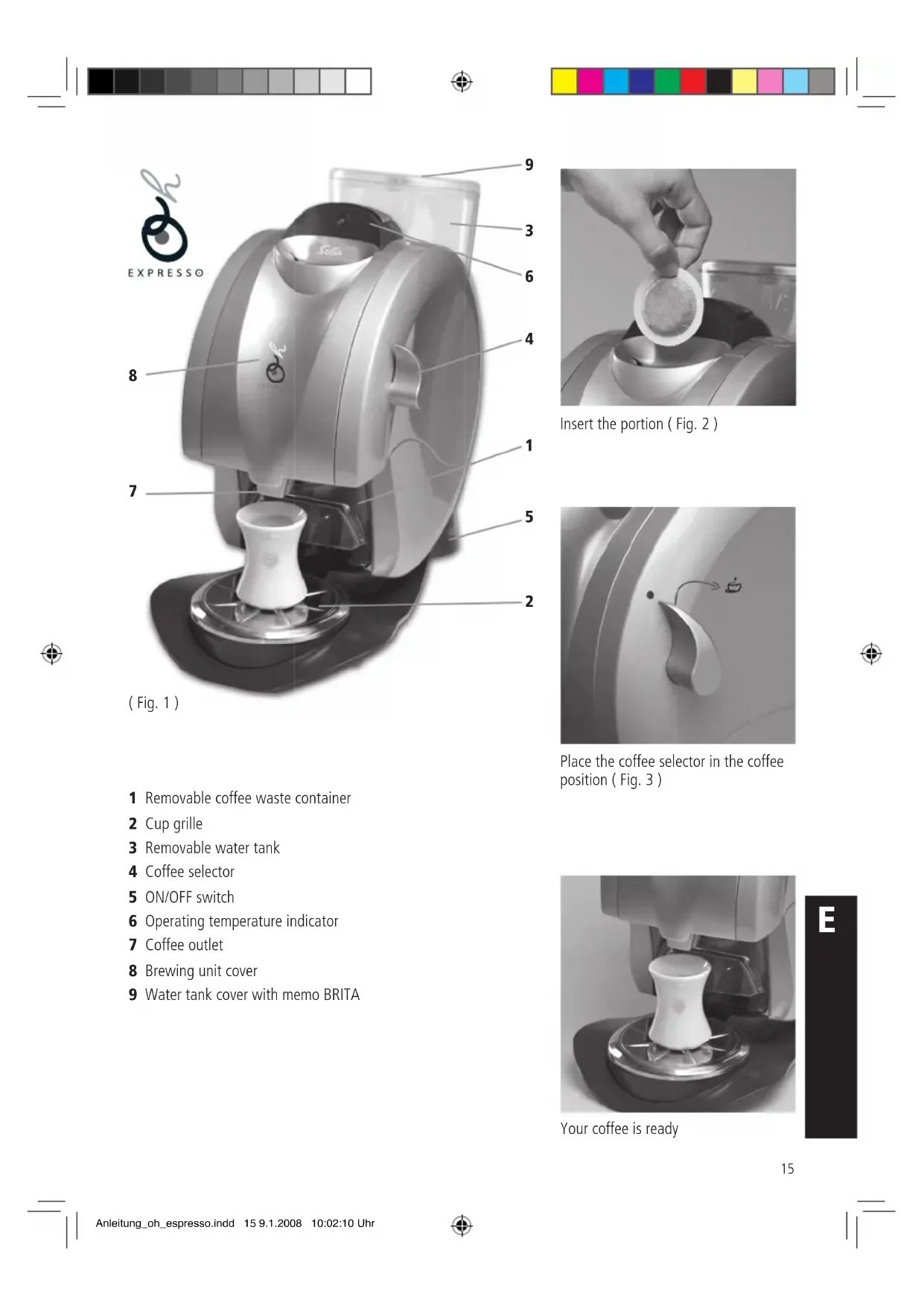 1 Removable coffee waste container 2 Cup grille 3 Removable water tank 4 Coffee selector 5 ON/OFF switch 6 Operating temperature indicator 7 Coffee outlet 8 Brewing unit cover 9 Water tank cover with memo BRITA Insert the portion ( Fig. 2 ) Place the coffee selector in the coffee position ( Fig. 3 ) Your coffee is ready ( Fig. 1 ) Anleitung_oh_espresso.indd 15 9.1.2008 10:02:10 Uhr16 Before using Please read the following instructions carefully. They contain important information about operating and caring for your appliance, as well as about safety. We recommend you retain these notes for future use.