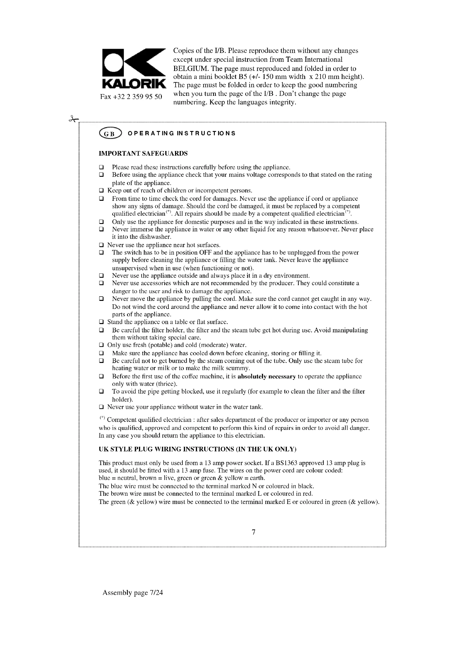 Competent qualified electrician : after sales department of the producer or importer or any person who is qualified, approved and competent to perform this kind of repairs in order to avoid all danger. In any case you should return the appliance to this electrician. UK STYLE PLUG WIRING INSTRUCTIONS (IN THE UK ONLY) This product must only be used from a 13 amp power socket. If a BS1363 approved 13 amp plug is used, it should be fitted with a 13 amp fuse. The wires on the power cord are colour coded: blue = neutral, brown = live, green or green & yellow = earth. The blue wire must be connected to the terminal marked N or coloured in black. The brown wire must be connected to the terminal marked L or coloured in red. The green (& yellow) wire must be connected to the terminal marked E or coloured in green (& yellow).Copies of the I/B. Please reproduce them without any changes except under special instruction from Team International BELGIUM. The page must reproduced and folded in order to obtain a mini booklet B5 (+/- 150 mm width x 210 mm height). The page must be folded in order to keep the good numbering when you turn the page of the I/B . Don‟t change the page numbering. Keep the languages integrity.