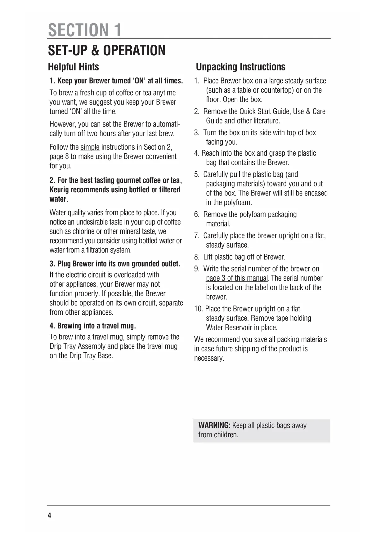 To brew a fresh cup of coffee or tea anytime you want, we suggest you keep your Brewer turned ‘ON’ all the time. However, you can set the Brewer to automati- cally turn off two hours after your last brew. Follow the simple instructions in Section 2, page 8 to make using the Brewer convenient for you.