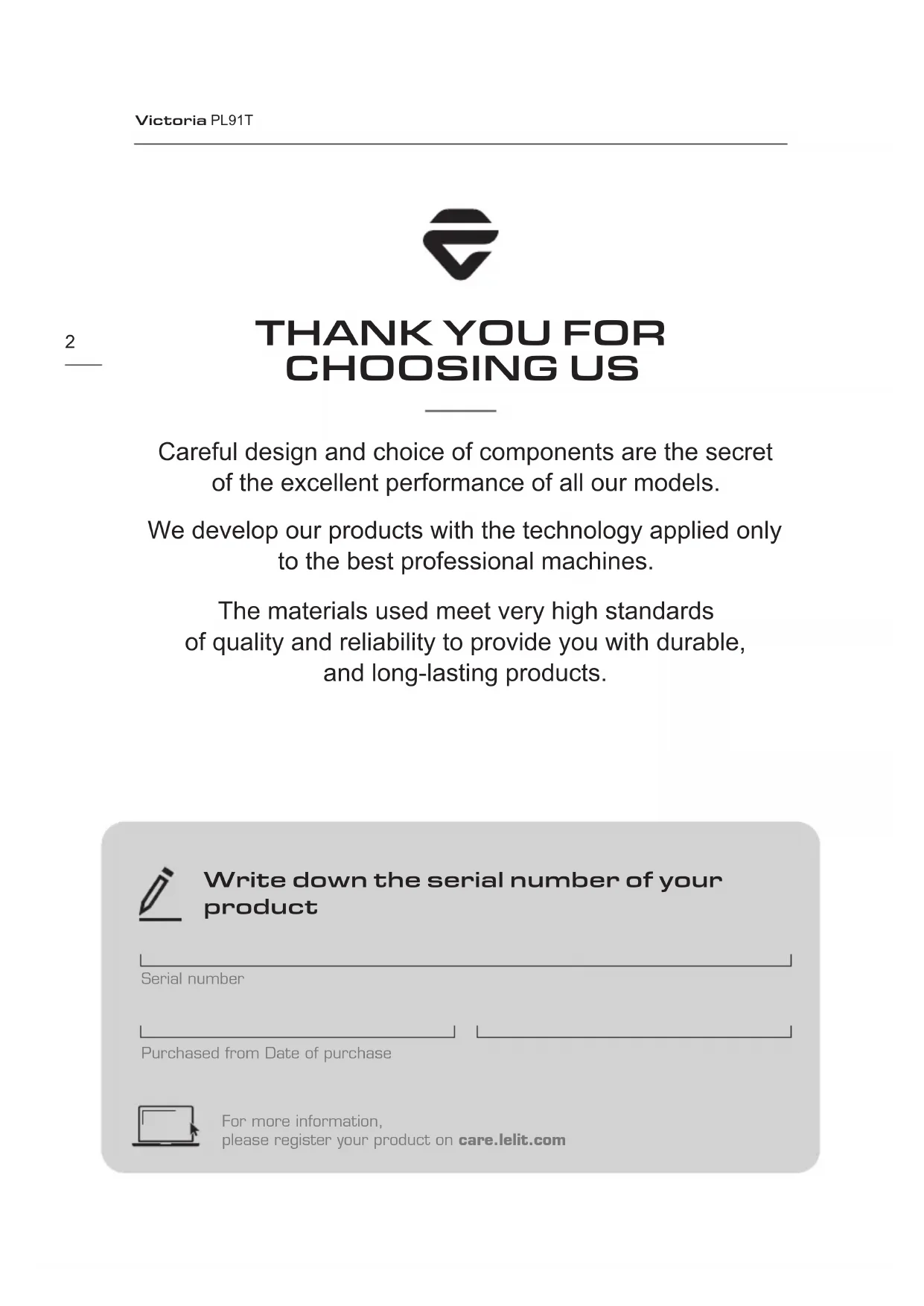 CHOOSING US Write down the serial number of your product Serial number Purchased from Date of purchase For more information, please register your product on care.lelit.com3 English