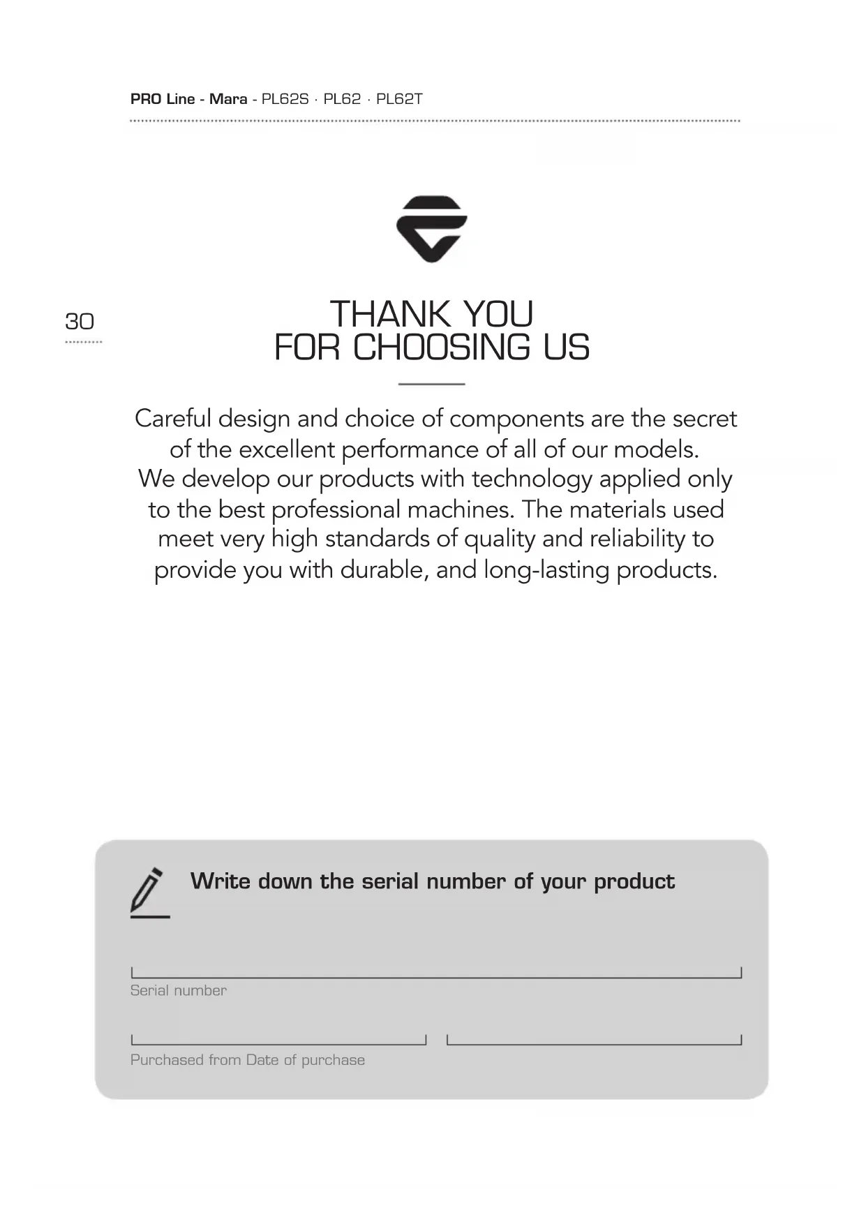 Indice Safety notes 32 Main specications 37 E61 type group 38 Product overview 39 Instructions for use 40 The art of espresso coffee 45 Cleaning and maintenance 49 Solving the most common problems 51 Warranty terms 52PRO Line - Mara - PL62S · PL62 · PL62T