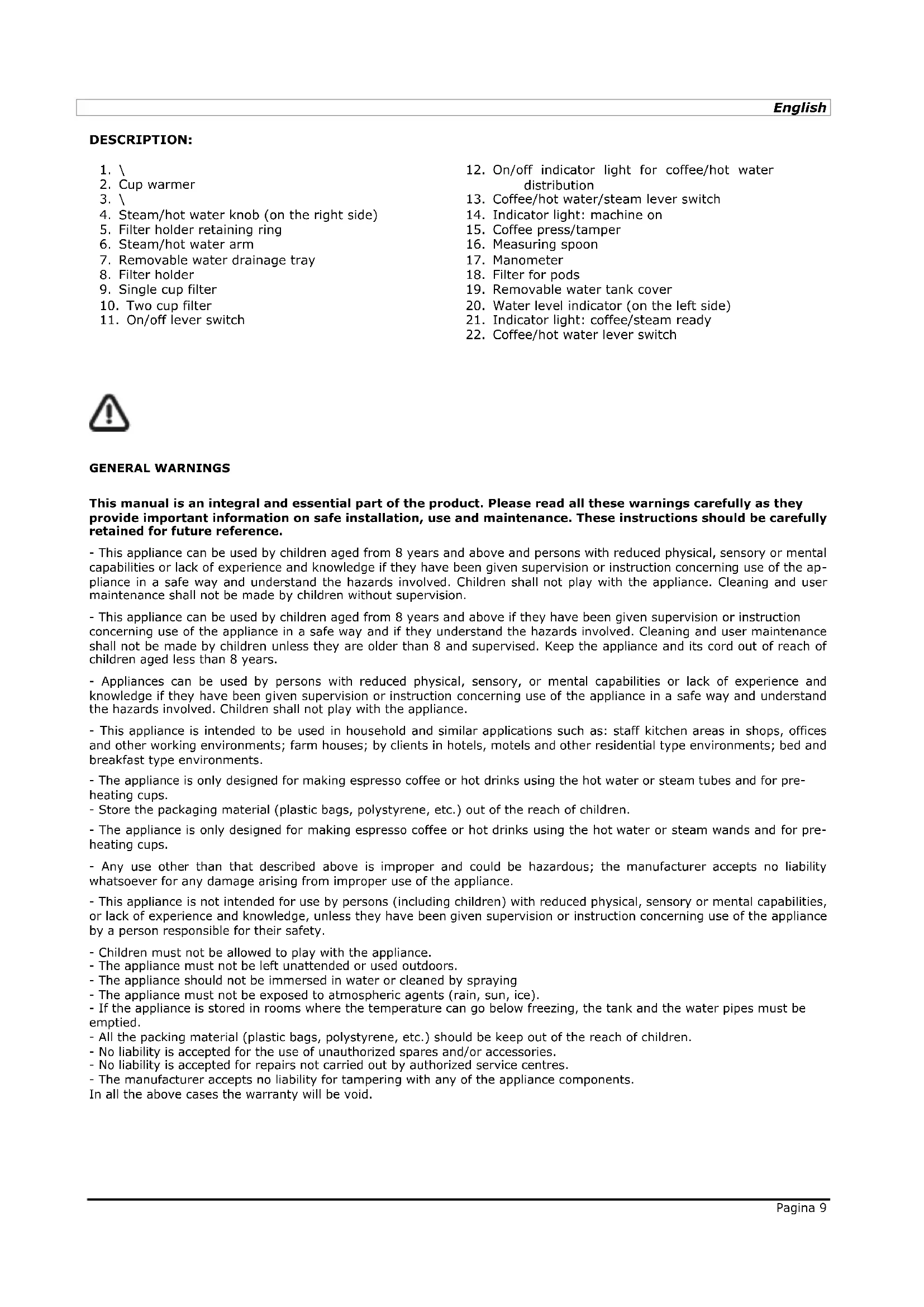 GENERAL WARNINGS This manual is an integral and essential part of the product. Please read all these warnings carefully as they provide important information on safe installation, use and maintenance. These instructions should be carefully retained for future reference. - This appliance can be used by children aged from 8 years and above and persons with reduced physical, sensory or mental capabilities or lack of experience and knowledge if they have been given supervision or instruction concerning use of the ap- pliance in a safe way and understand the hazards involved. Children shall not play with the appliance. Cleaning and user maintenance shall not be made by children without supervision. - This appliance can be used by children aged from 8 years and above if they have been given supervision or instruction concerning use of the appliance in a safe way and if they understand the hazards involved. Cleaning and user maintenance shall not be made by children unless they are older than 8 and supervised. Keep the appliance and its cord out of reach of children aged less than 8 years. - Appliances can be used by persons with reduced physical, sensory, or mental capabilities or lack of experience and knowledge if they have been given supervision or instruction concerning use of the appliance in a safe way and understand the hazards involved. Children shall not play with the appliance. - This appliance is intended to be used in household and similar applications such as: staff kitchen areas in shops, offices and other working environments; farm houses; by clients in hotels, motels and other residential type environments; bed and breakfast type environments. - The appliance is only designed for making espresso coffee or hot drinks using the hot water or steam tubes and for pre- heating cups. - Store the packaging material (plastic bags, polystyrene, etc.) out of the reach of children. - The appliance is only designed for making espresso coffee or hot drinks using the hot water or steam wands and for pre- heating cups. - Any use other than that described above is improper and could be hazardous; the manufacturer accepts no liability whatsoever for any damage arising from improper use of the appliance. - This appliance is not intended for use by persons (including children) with reduced physical, sensory or mental capabilities, or lack of experience and knowledge, unless they have been given supervision or instruction concerning use of the appliance by a person responsible for their safety. - Children must not be allowed to play with the appliance. - The appliance must not be left unattended or used outdoors. - The appliance should not be immersed in water or cleaned by spraying - The appliance must not be exposed to atmospheric agents (rain, sun, ice). - If the appliance is stored in rooms where the temperature can go below freezing, the tank and the water pipes must be emptied. - All the packing material (plastic bags, polystyrene, etc.) should be keep out of the reach of children. - No liability is accepted for the use of unauthorized spares and/or accessories. - No liability is accepted for repairs not carried out by authorized service centres. - The manufacturer accepts no liability for tampering with any of the appliance components. In all the above cases the warranty will be void.Pagina 10 English