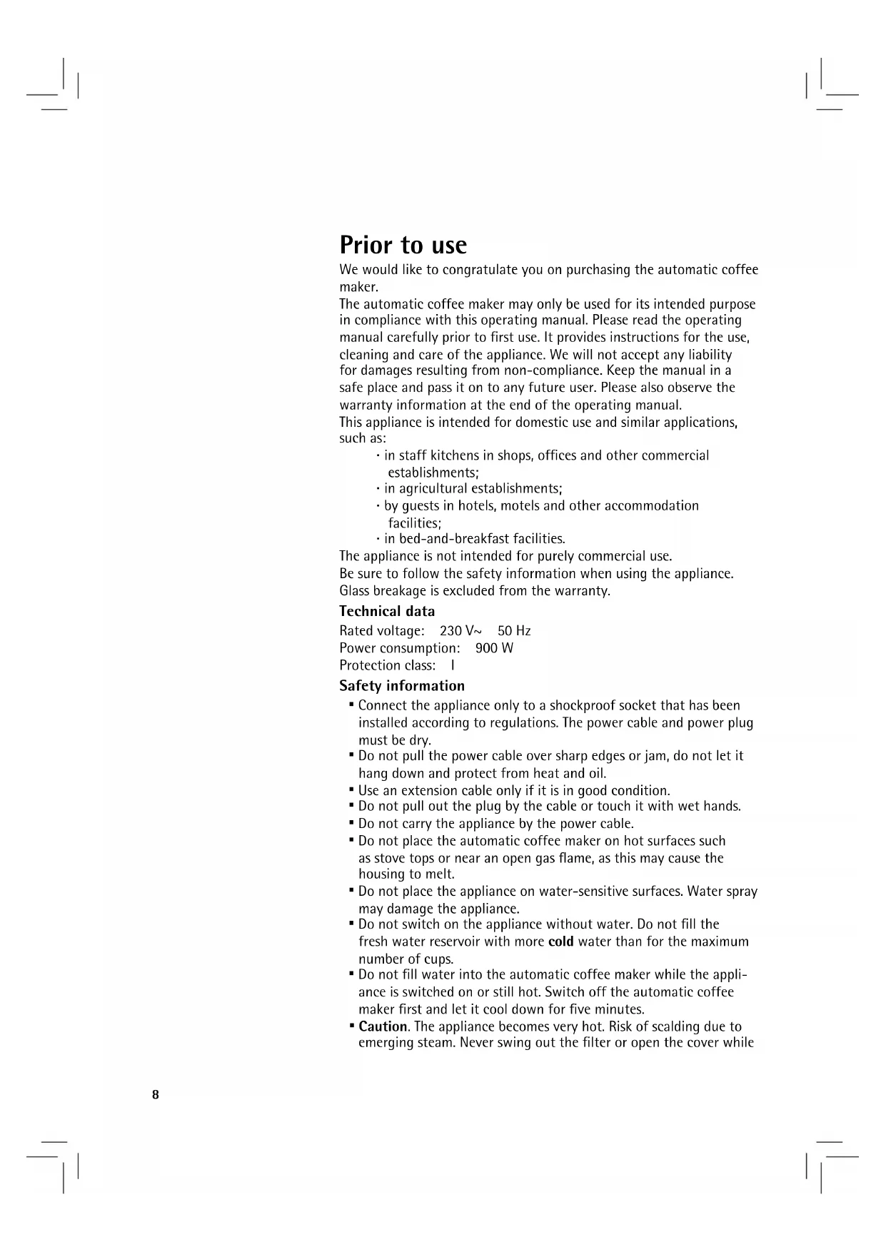 universal ist im ausgewählten Fachhandel oder bei wmf consumer electric in einer 500 ml-Flasche erhältlich.8 Prior to use We would like to congratulate you on purchasing the automatic coffee maker. The automatic coffee maker may only be used for its intended purpose in compliance with this operating manual. Please read the operating manual carefully prior to first use. It provides instructions for the use, cleaning and care of the appliance. We will not accept any liability for damages resulting from non-compliance. Keep the manual in a safe place and pass it on to any future user. Please also observe the warranty information at the end of the operating manual. This appliance is intended for domestic use and similar applications, such as: ⋅ in staff kitchens in shops, offices and other commercial establishments; ⋅ in agricultural establishments; ⋅ by guests in hotels, motels and other accommodation facilities; ⋅ in bed-and-breakfast facilities. The appliance is not intended for purely commercial use. Be sure to follow the safety information when using the appliance. Glass breakage is excluded from the warranty. Technical data Rated voltage: 230 V~ 50 Hz Power consumption: 900 W Protection class: I Safety information