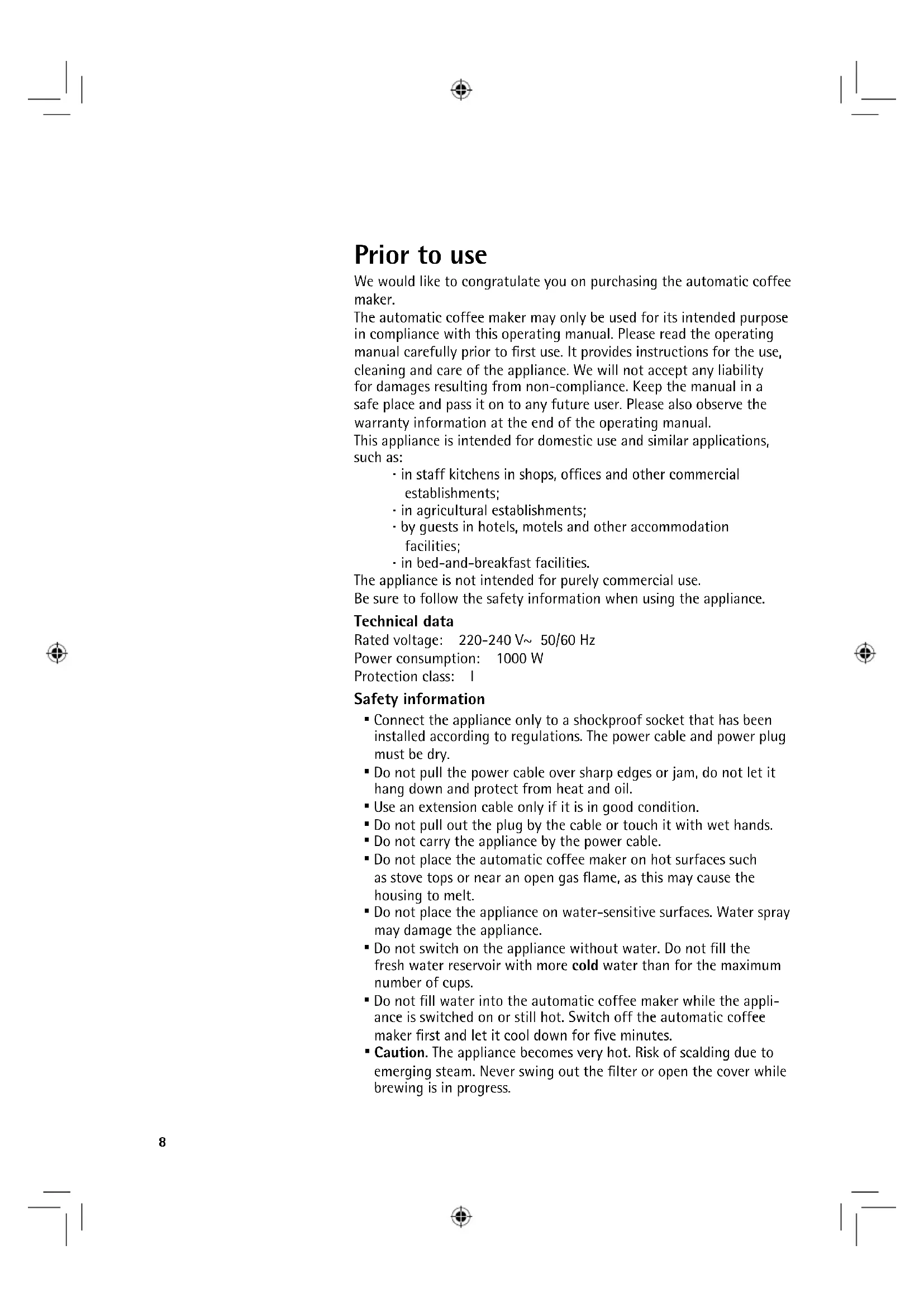 universal ist im ausgewählten Fachhandel oder bei wmf consumer electric in einer 500 ml-Flasche erhältlich.8 Prior to use We would like to congratulate you on purchasing the automatic coffee maker. The automatic coffee maker may only be used for its intended purpose in compliance with this operating manual. Please read the operating manual carefully prior to first use. It provides instructions for the use, cleaning and care of the appliance. We will not accept any liability for damages resulting from non-compliance. Keep the manual in a safe place and pass it on to any future user. Please also observe the warranty information at the end of the operating manual. This appliance is intended for domestic use and similar applications, such as: ⋅ in staff kitchens in shops, offices and other commercial establishments; ⋅ in agricultural establishments; ⋅ by guests in hotels, motels and other accommodation facilities; ⋅ in bed-and-breakfast facilities. The appliance is not intended for purely commercial use. Be sure to follow the safety information when using the appliance. Technical data Rated voltage: 220-240 V~ 50/60 Hz Power consumption: 1000 W Protection class: I Safety information