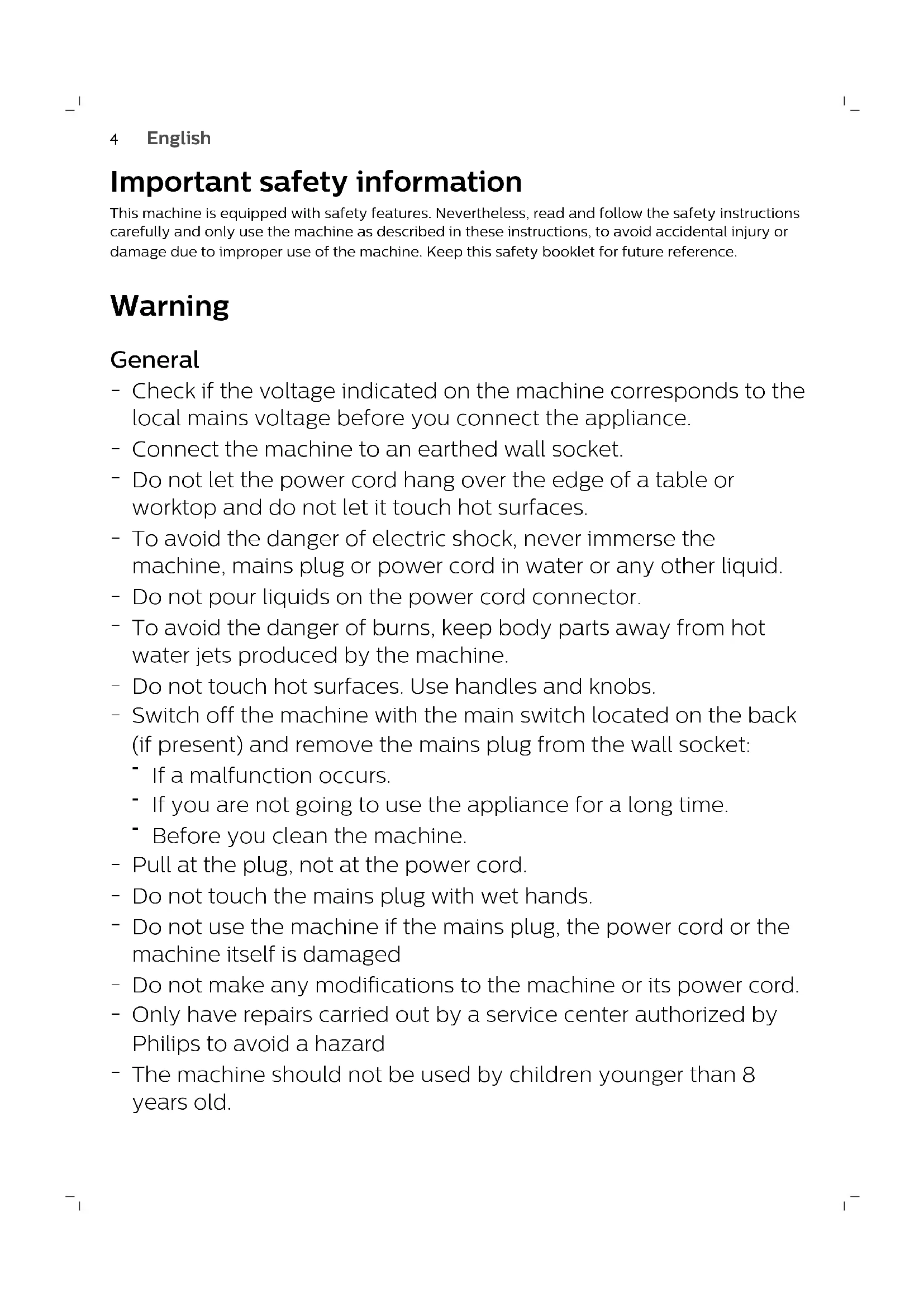 Keep the machine and its cord out of the reach of children aged less than 8 years.