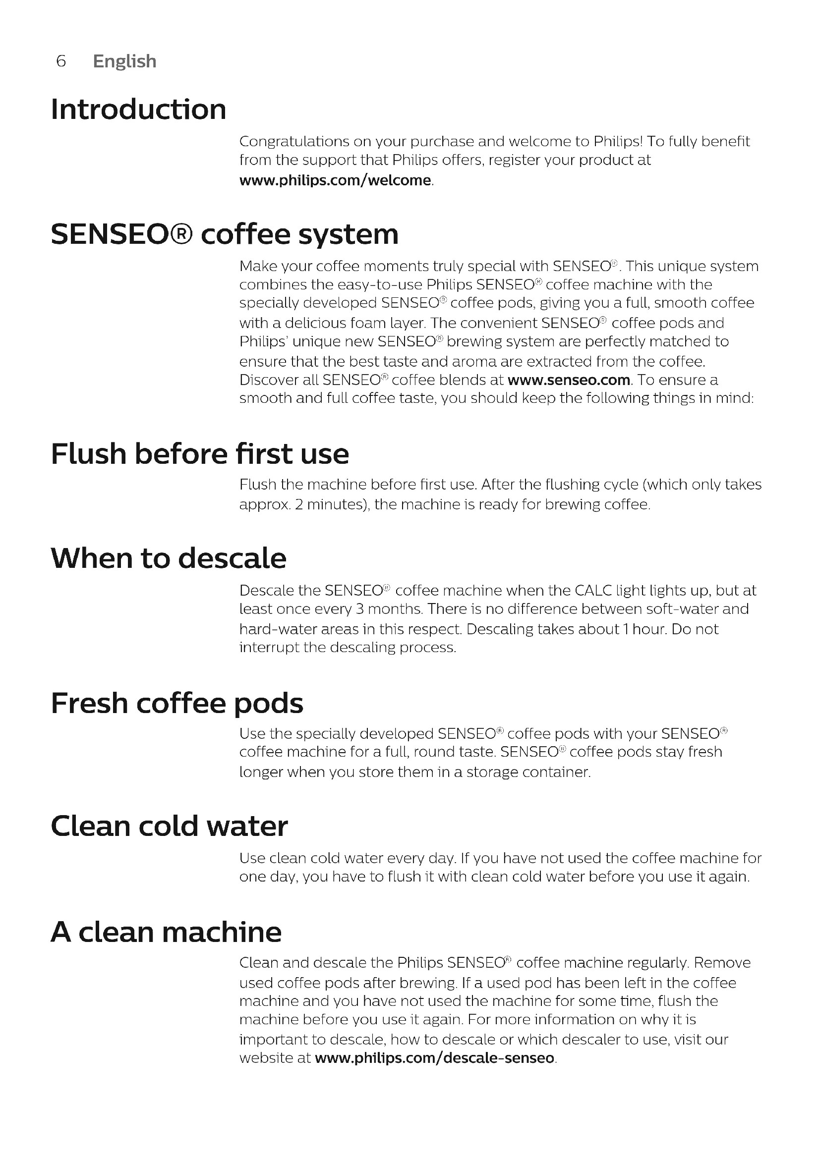 coffee machine regularly. Remove used coffee pods after brewing. If a used pod has been left in the coffee machine and you have not used the machine for some time, flush the machine before you use it again. For more information on why it is important to descale, how to descale or which descaler to use, visit our website at www.philips.com/descale-senseo.