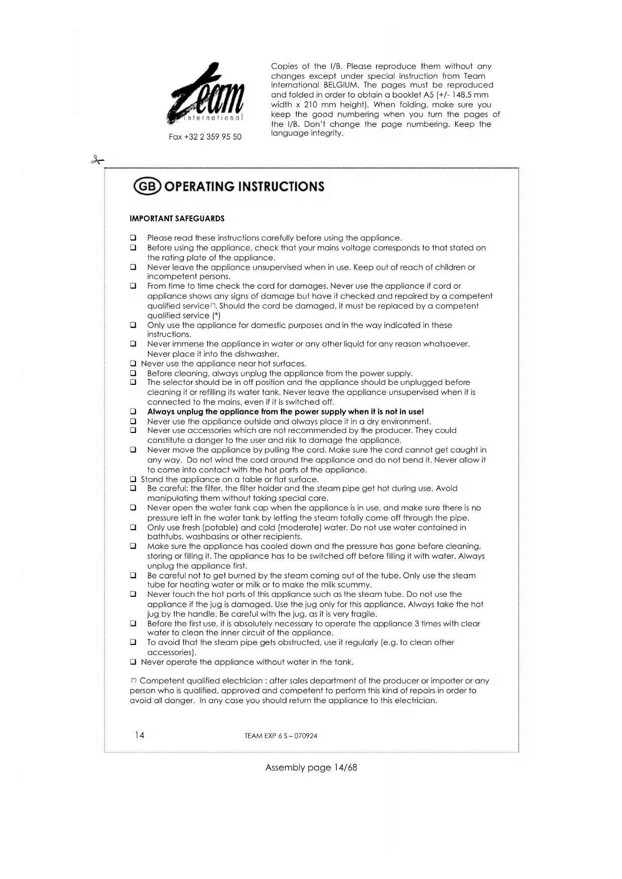 Copies of the I/B. Please reproduce them without any changes except under special instruction from Team International BELGIUM. The pages must be reproduced and folded in order to obtain a booklet A5 (+/- 148.5 mm width x 210 mm height). When folding, make sure you keep the good numbering when you turn the pages of the I/B. Don't change the page numbering. Keep the language integrity.