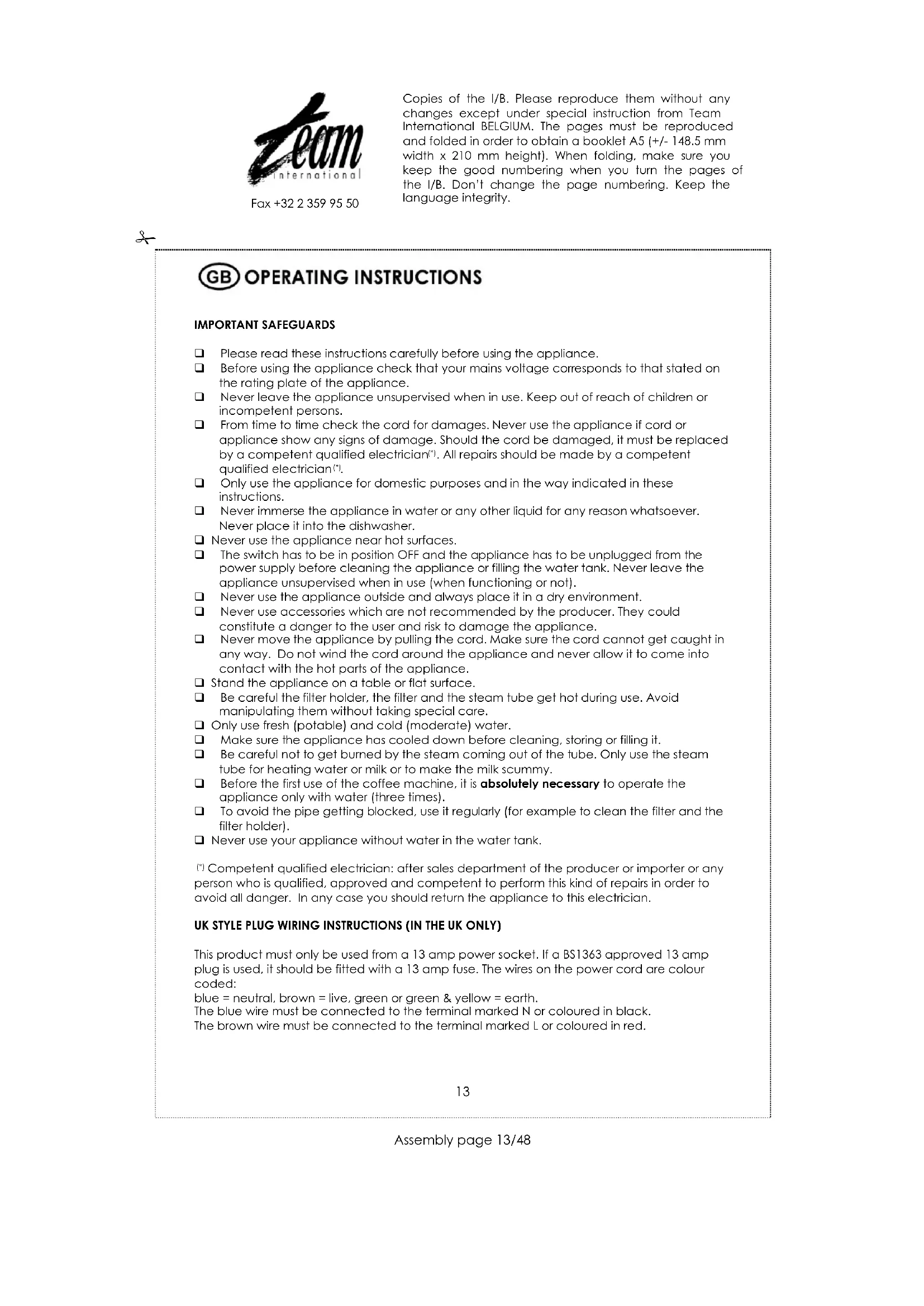 Copies of the I/B. Please reproduce them without any changes except under special instruction from Team International BELGIUM. The pages must be reproduced and folded in order to obtain a booklet A5 (+/- 148.5 mm width x 210 mm height). When folding, make sure you keep the good numbering when you turn the pages of the I/B. Don't change the page numbering. Keep the language integrity.