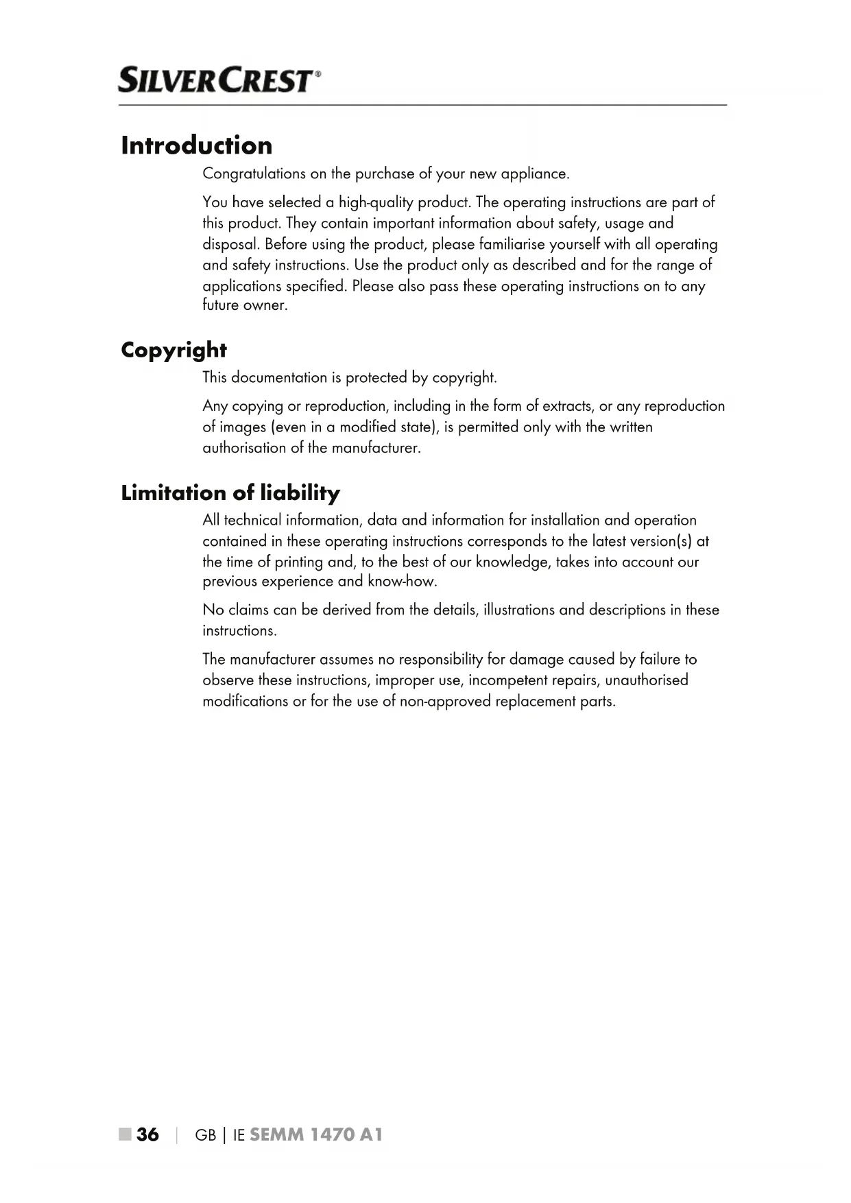 Introduction Congratulations on the purchase of your new appliance. You have selected a high-quality product. The operating instructions are part of this product. They contain important information about safety, usage and disposal. Before using the product, please familiarise yourself with all operating and safety instructions. Use the product only as described and for the range of applications specified. Please also pass these operating instructions on to any future owner. Copyright This documentation is protected by copyright. Any copying or reproduction, including in the form of extracts, or any reproduction of images (even in a modified state), is permitted only with the written authorisation of the manufacturer. Limitation of liability All technical information, data and information for installation and operation contained in these operating instructions corresponds to the latest version(s) at the time of printing and, to the best of our knowledge, takes into account our previous experience and know-how. No claims can be derived from the details, illustrations and descriptions in these instructions. The manufacturer assumes no responsibility for damage caused by failure to observe these instructions, improper use, incompetent repairs, unauthorised modifications or for the use of non-approved replacement parts.GB