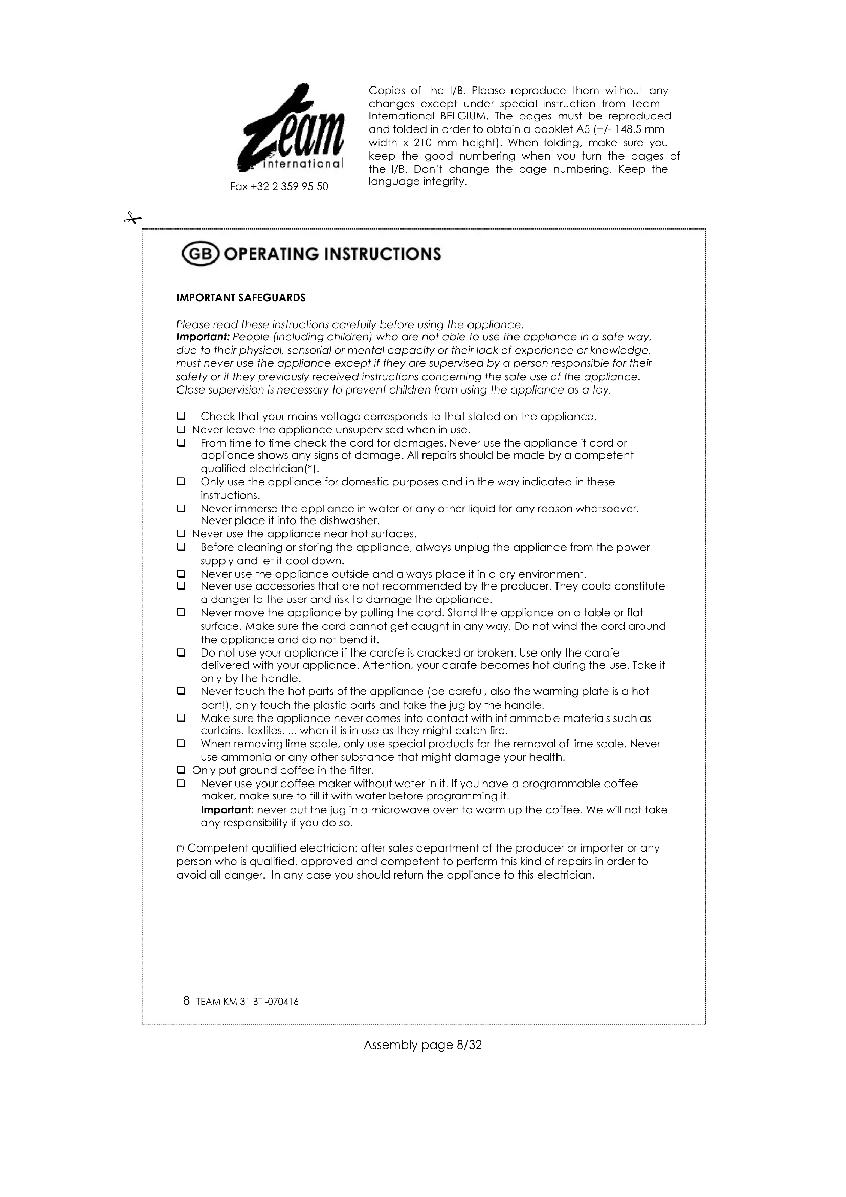 Copies of the I/B. Please reproduce them without any changes except under special instruction from Team International BELGIUM. The pages must be reproduced and folded in order to obtain a booklet A5 (+/- 148.5 mm width x 210 mm height). When folding, make sure you keep the good numbering when you turn the pages of the I/B. Don't change the page numbering. Keep the language integrity.