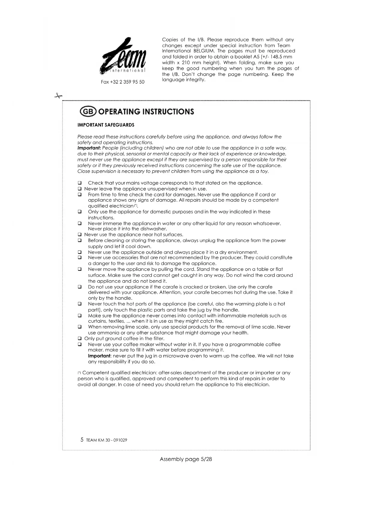 Fax +32 2 359 95 50 Copies of the I/B. Please reproduce them without any changes except under special instruction from Team International BELGIUM. The pages must be reproduced and folded in order to obtain a booklet A5 (+/- 148.5 mm width x 210 mm height). When folding, make sure you keep the good numbering when you turn the pages of the I/B. Don’t change the page numbering. Keep the language integrity.