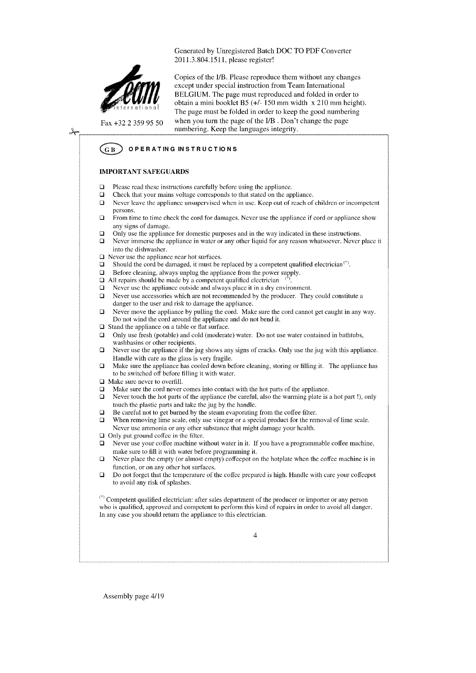 Copies of the I/B. Please reproduce them without any changes except under special instruction from Team International BELGIUM. The page must reproduced and folded in order to obtain a mini booklet B5 (+ / - 150mm width x 210~mm height). The page must be folded in order to keep the good numbering when you turn the page of the I/B. Don't change the page numbering. Keep the languages integrity.