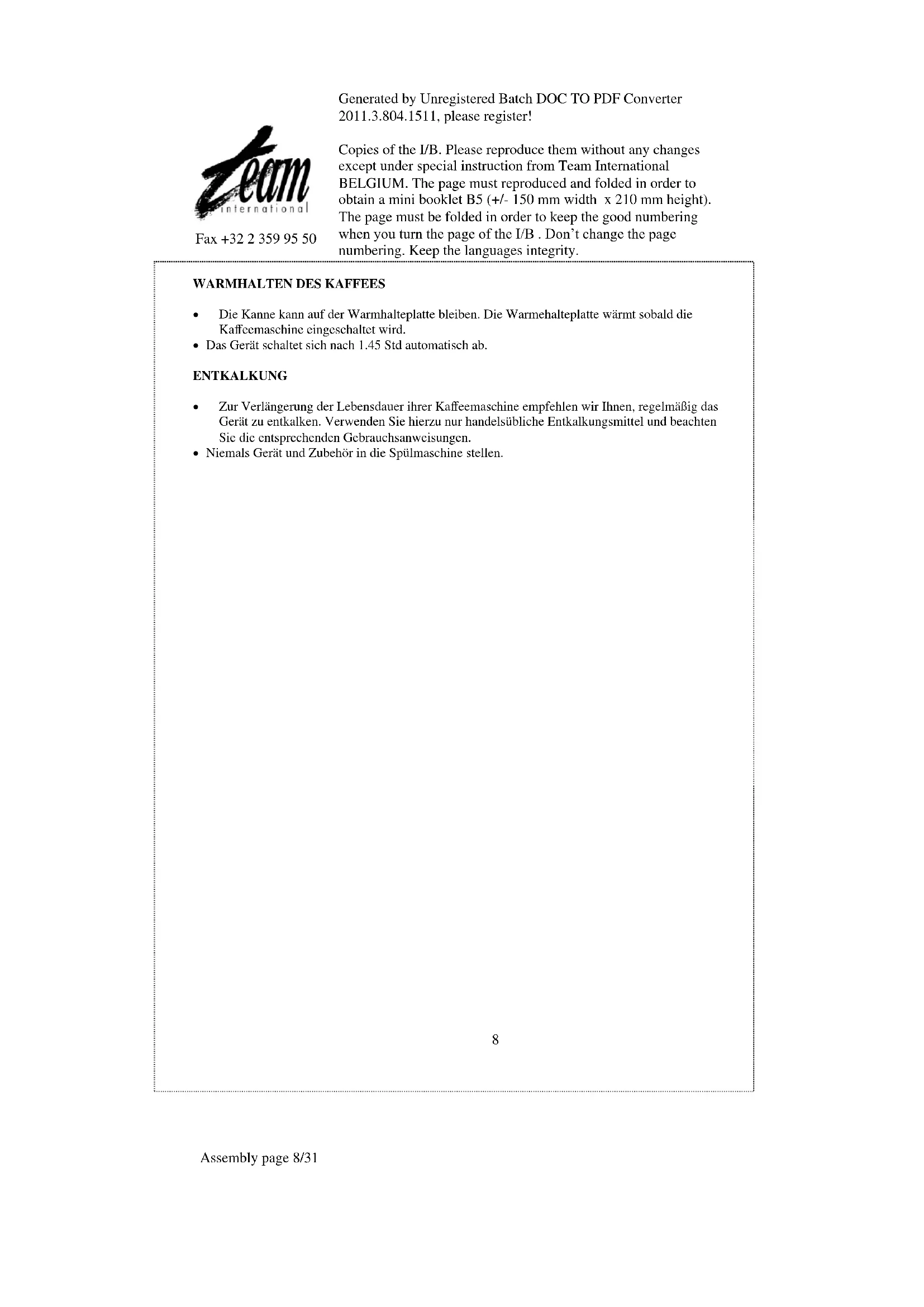 Fax +32 2 359 95 50 Generated by Unregistered Batch DOC TO PDF Converter 2011.3.804.1511, please register! Copies of the I/B. Please reproduce them without any changes except under special instruction from Team International BELGIUM. The page must reproduced and folded in order to obtain a mini booklet B5 (+/- 150 mm width x 210 mm height). The page must be folded in order to keep the good numbering when you turn the page of the I/B . Don’t change the page numbering. Keep the languages integrity.