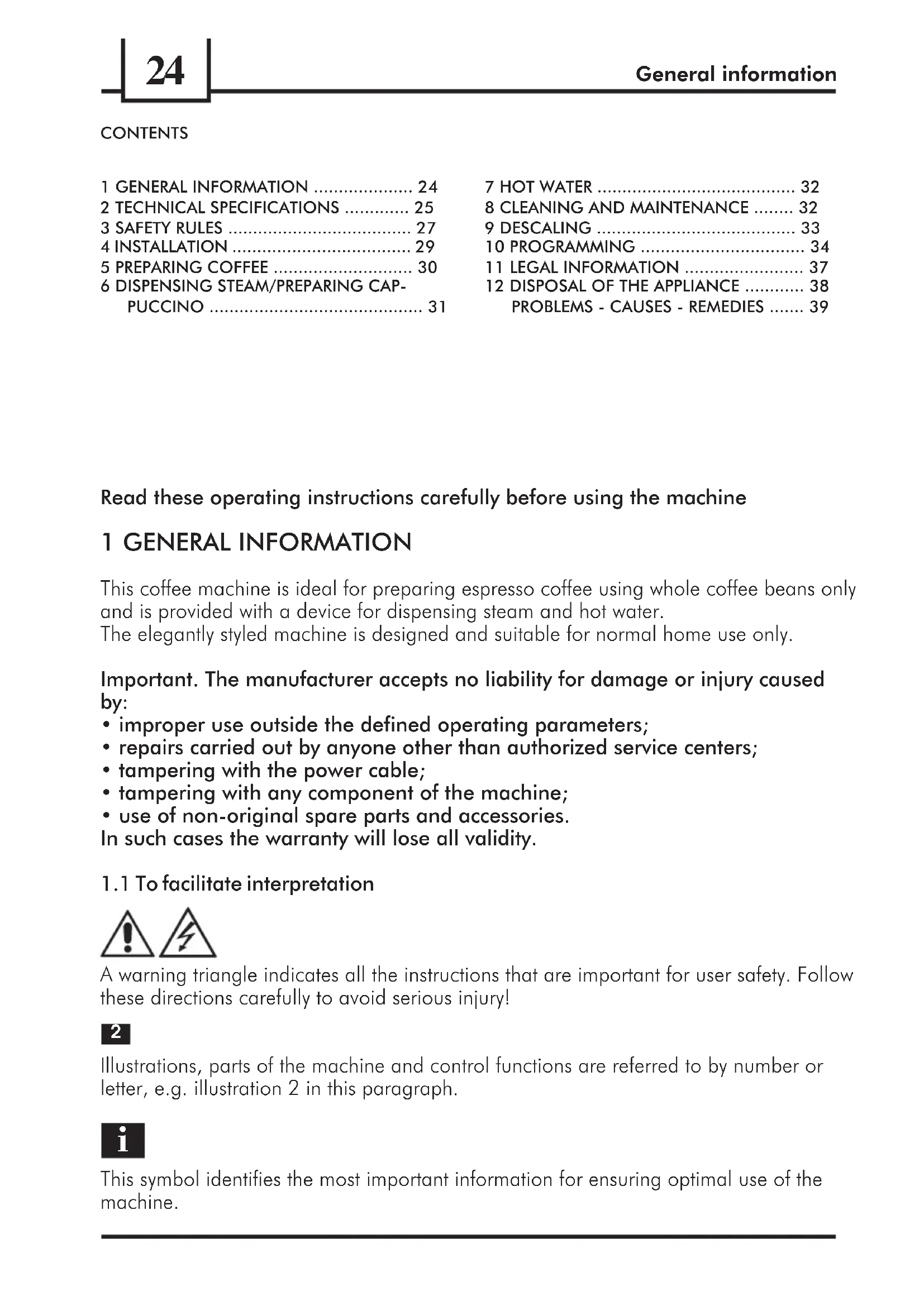 General information Read these operating instructions carefully before using the machine 1 GENERAL INFORMATION This coffee machine is ideal for preparing espresso coffee using whole coffee beans only and is provided with a device for dispensing steam and hot water. The elegantly styled machine is designed and suitable for normal home use only. Important. The manufacturer accepts no liability for damage or injury caused by: improper use outside the defined operating parameters; repairs carried out by anyone other than authorized service centers; tampering with the power cable; tampering with any component of the machine; use of non-original spare parts and accessories. In such cases the warranty will lose all validity.