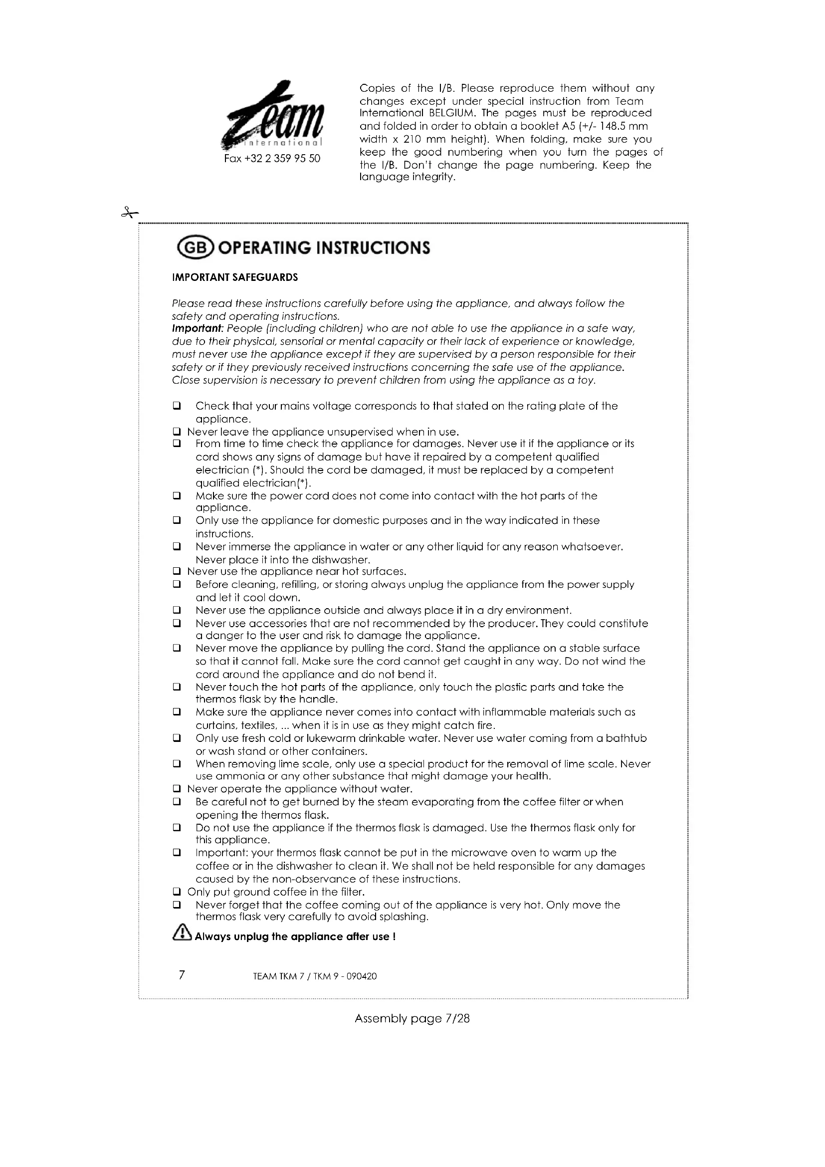 Download the instructions for your Coffee machine in PDF format for free! Find your manual TKM 9 - TEAM and take your electronic device back in hand. On this page are published all the documents necessary for the use of your device. TKM 9 by TEAM.