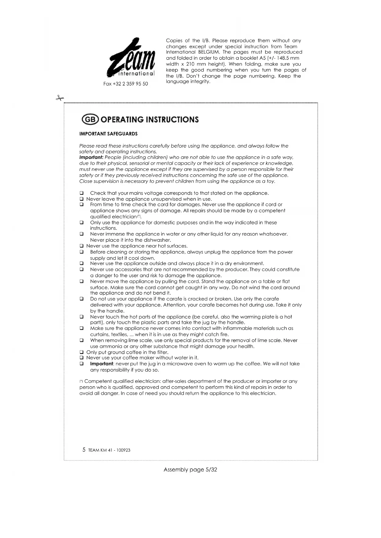 Before cleaning, turn off the appliance, unplug it and let it cool down. The coffee maker can be cleaned using a damp cloth. Never immerse the body of your coffee maker in water or any other liquid. Never use abrasive cleaning products or solvents. Decalcifying the coffee maker prolongs its life span. For decalcification only use products especially made for the decalcification of coffee makers. Copies of the I/B. Please reproduce them without any changes except under special instruction from Team International BELGIUM. The pages must be reproduced and folded in order to obtain a booklet A5 (+/- 148.5 mm width x 210 mm height). When folding, make sure you keep the good numbering when you turn the pages of the I/B. Don’t change the page numbering. Keep the language integrity.