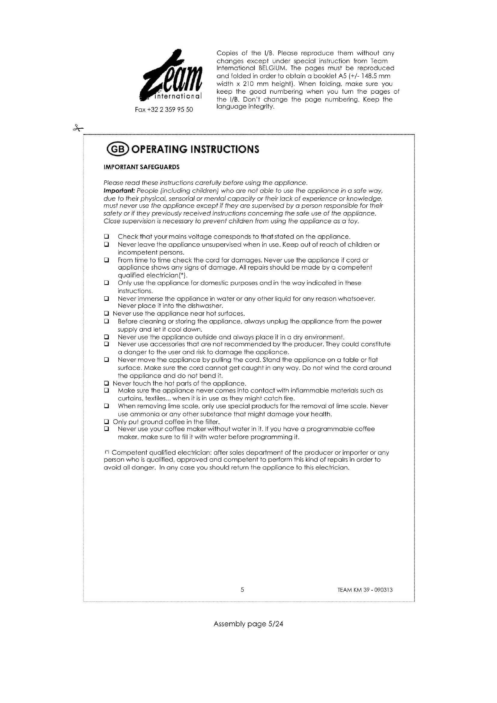 Copies of the I/B. Please reproduce them without any changes except under special instruction from Team International BELGIUM. The pages must be reproduced and folded in order to obtain a booklet A5 (+/- 148.5 mm width x 210 mm height). When folding, make sure you keep the good numbering when you turn the pages of the I/B. Don't change the page numbering. Keep the language integrity.