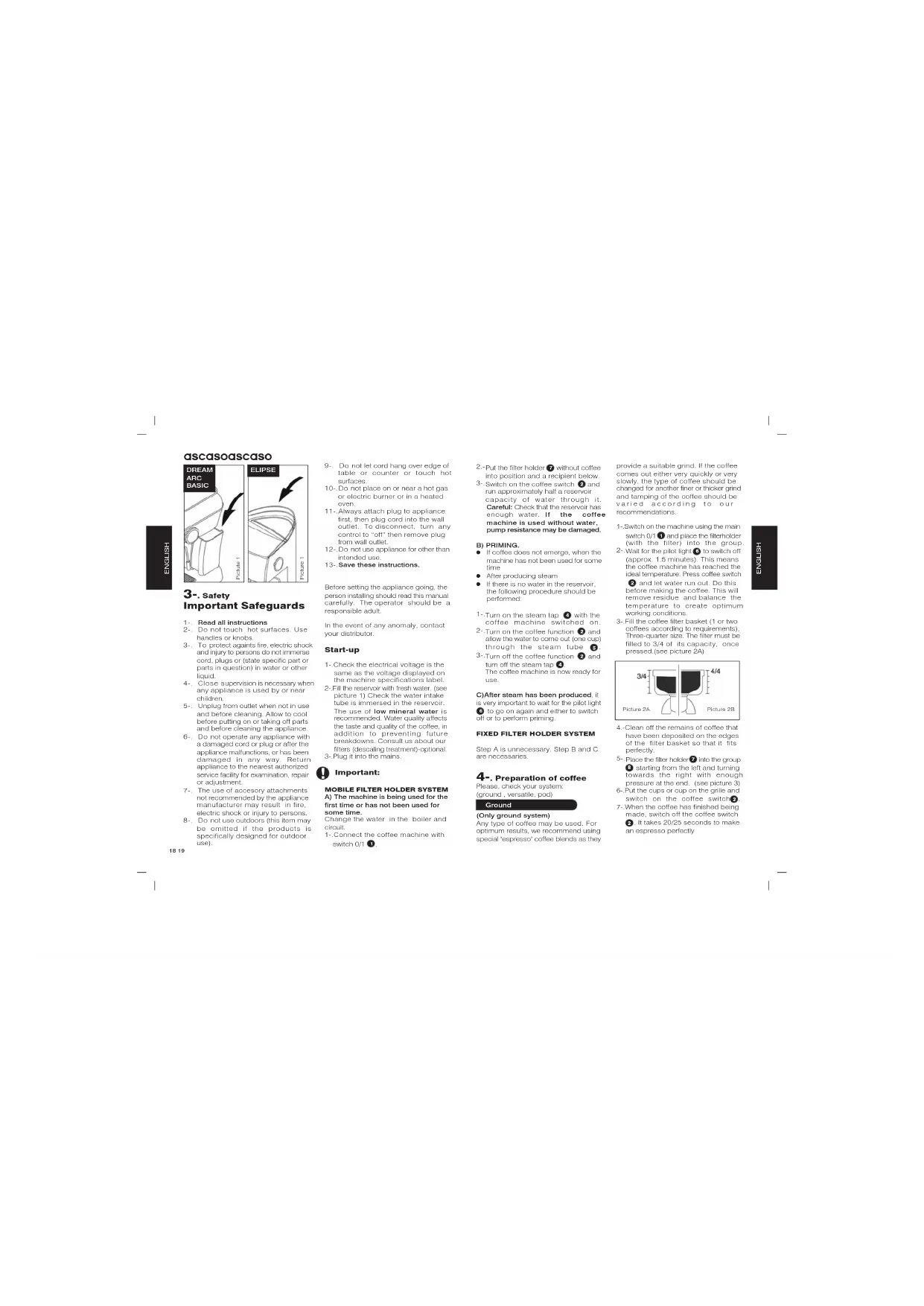 . Do the opposite operation afterhaving obtained the required water. 7-. Maintenance and cleaning General warning: Cleaning and maintenance should be done when the appliance is cold and disconnected from the mains. Do not immerse the appliance in water. It should not be cleaned in a dishwasher. 1-. Cleaning the outside: To clean the outside of the machine, use alcohol 96º or specific products for polished aluminium. if you have a colour dream, for the painted parts, you can use a soft cloth, moistened with water. Remove the tray regularly and clean it. If the machine is not to be used for some time, empty the water reservoir. Clean the steam tube with a damp cloth immediately after use. To cleanthe inside of the steam tube, allow the water to circulate. To clean the absorption hole, you can use a toothpick or a paperclip. This will ensure the tube is free of blockages. 2-. Internal cleaning: To obtain top quality espresso coffee it is vital to clean the inner workings of the machine. To clean the interior of the distribution unit, use Ascaso Coffee Washer. This product is also useful to prevent limescale buildup in the machine. Regular descaling will contribute to ensuring top quality coffee and it will prolong the useful life of the machine. Consult your distributor. Coffee Washer use recommendations: To avoid limescale buildup, you can also use water treatment filters. However, it is advisable to clean the machine in accordance with consumption. Using filters and Coffee Washer will help to maintain the coffee machine in optimum working condition for longer. Important It is advisable not to leave the pod or ground coffee in the filterholder. Otherwise, coffee will build up affecting the taste of the coffee. Should this occur, run a load of water through the system. 3-. Cleaning the filterholders and the showerheads Mobile filterholder: Wash the filterholder in hot water with a neutral detergent. Rinse thoroughly. Dry the filterholder with a soft cloth. Do not wash it in the dishwasher. The filters, tray and reservoir can be cleaned in the top of the dishwasher. If you wash them by hand, do not forget to rinse thoroughly. Dry with a soft cloth. Use a brush or similar item to remove coffee residue from the showerhead. Important (Mobile filterholder) The showerhead must be cleaned after 80 to 100 espresso coffees have been made. This should done as follows: Remove and clean the showerhead with hot water with a neutral detergent. Once clean, replace it, following the instructions for the previous operation in reverse. 8-. Guarantee The guarantee for this appliance is the receipt of purchase. Please keep this. This receipt must be shown at the Service Centre in the event of breakdown. This appliance is guaranteed for our distributor(from the date of purchase) against any manufacturing fault or in the materials used. The amount paid for transport and packaging which may arise are payable by the user. This guarantee will not be valid if: 1-.The receipt of purchase is not presented. 2-.The machine has not been cleaned sufficiently or limescale has built up. 3-.The machine has not been cleaned suficiently or limescale has built up. 4-.The appliance has been dismantled by people who are not authorised by the Ascaso Official Technical Assistance Network. 9-. EC declaration of conformity ASCASO FACTORY SL declares that the product referred to in this declaration - espresso coffee machine - complies with the requirements of the Directive of 14th of June 1989 on the standardisation of the laws of Member States with regard to machinery (89/392/EEC), on electrical material (73/23/EEC) and on electromagnetic compatibility (89/396/EEC). ascaso ascaso ENGLISH ENGLISH