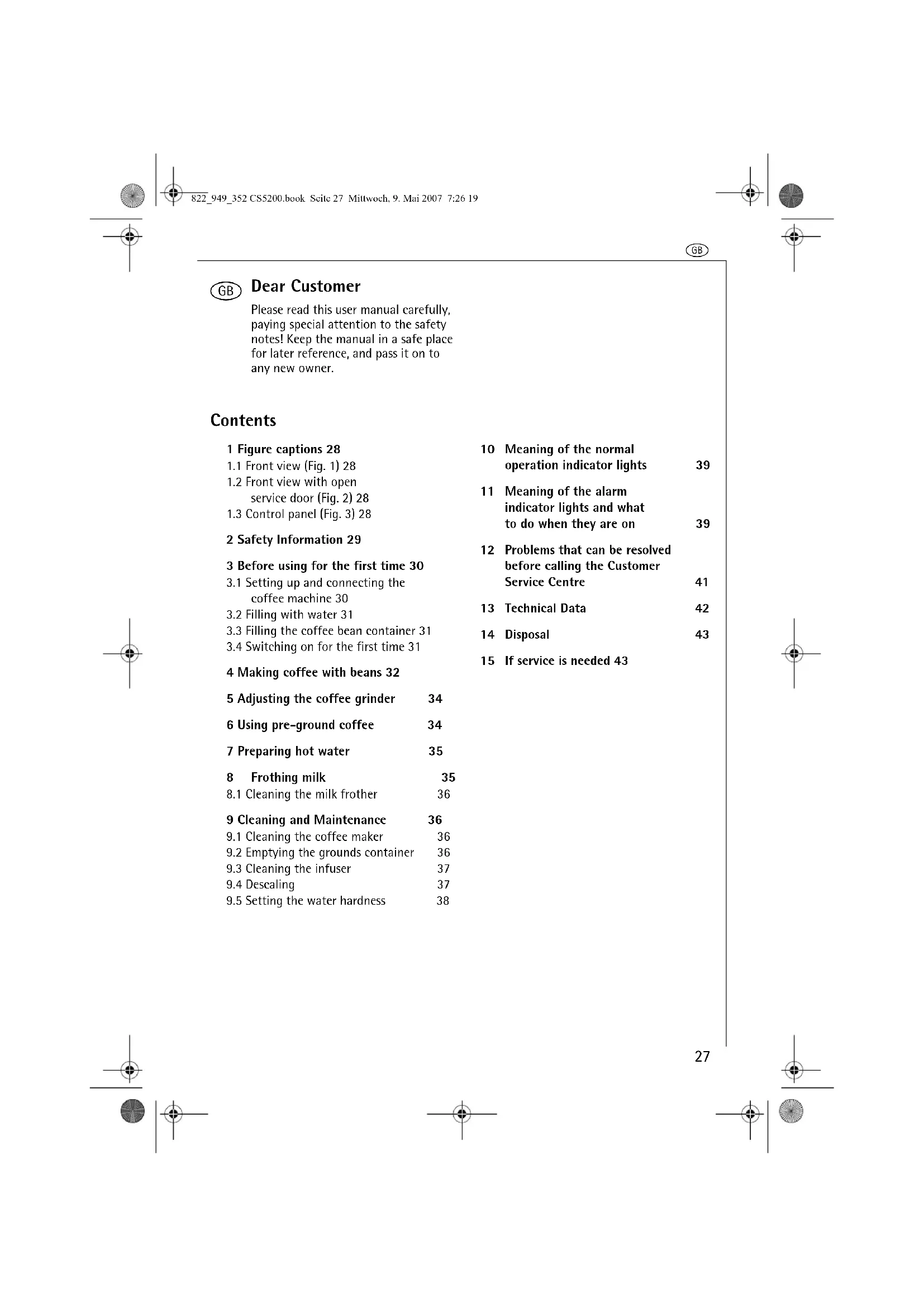 10 Meaning of the normal operation indicator lights 39 11 Meaning of the alarm indicator lights and what to do when they are on 39 12 Problems that can be resolved before calling the Customer Service Centre 41 13 Technical Data 42 14 Disposal 43 15 If service is needed 43 822_949_352 CS5200.book Seite 27 Mittwoch, 9. Mai 2007 7:26 19g