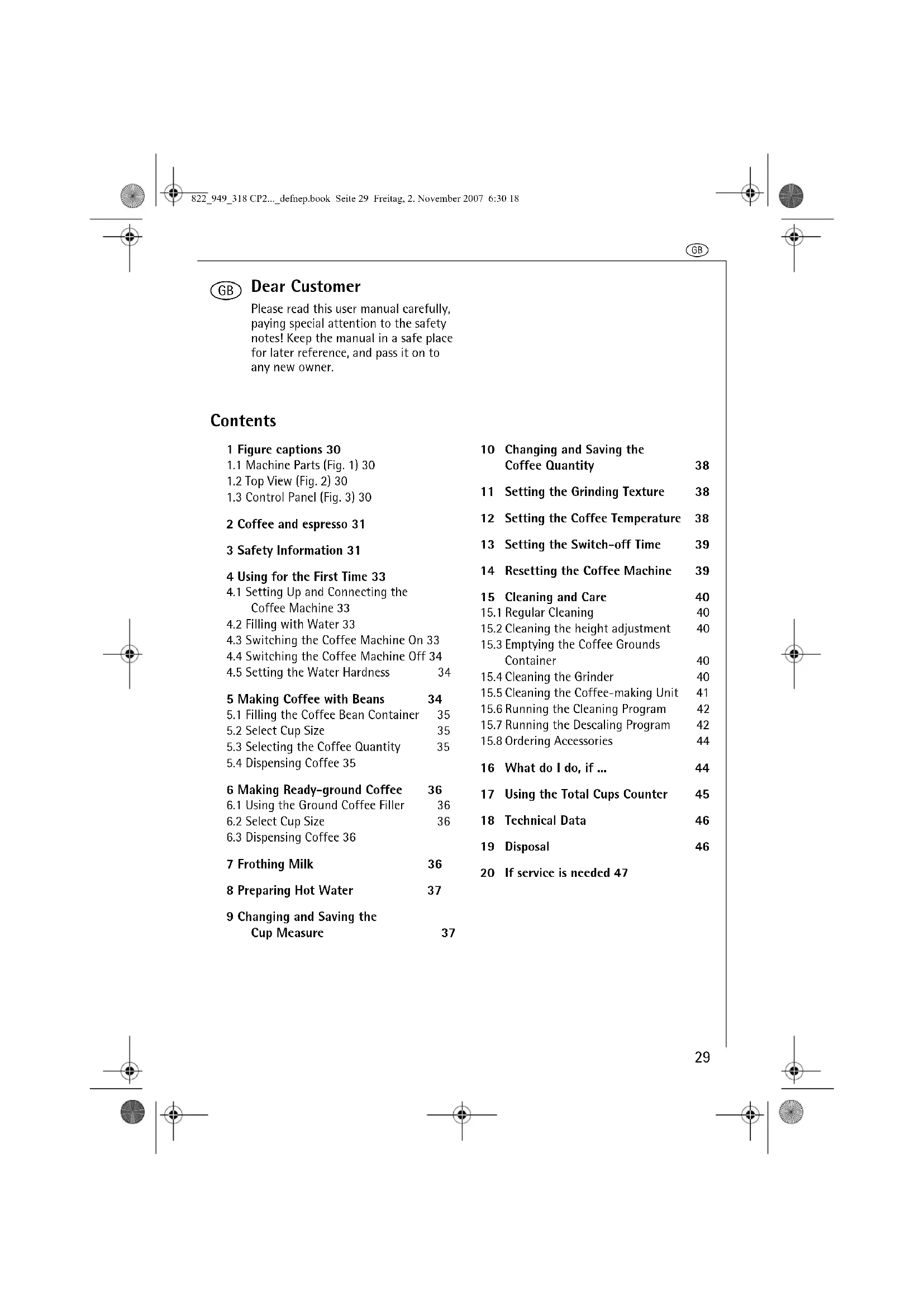 After running the descaling program, you are advised to throw away the first cup of coffee from the machine. 822_949_318 CP2..._defnep.book Seite 43 Freitag, 2. November 2007 6:30 18g