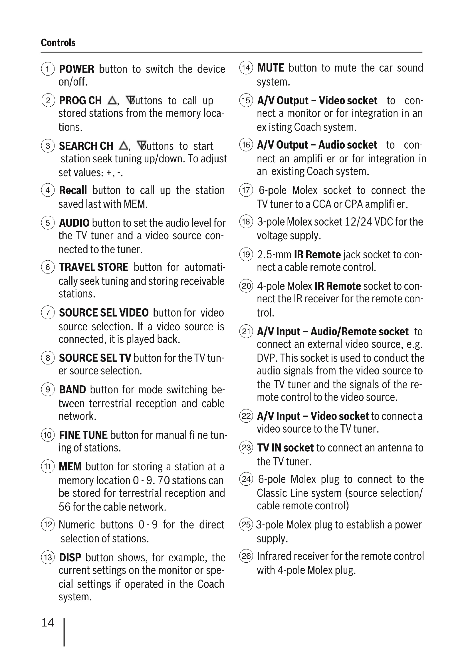 15 A/V Output - Video socket to connect a monitor or for integration in an existing Coach system.