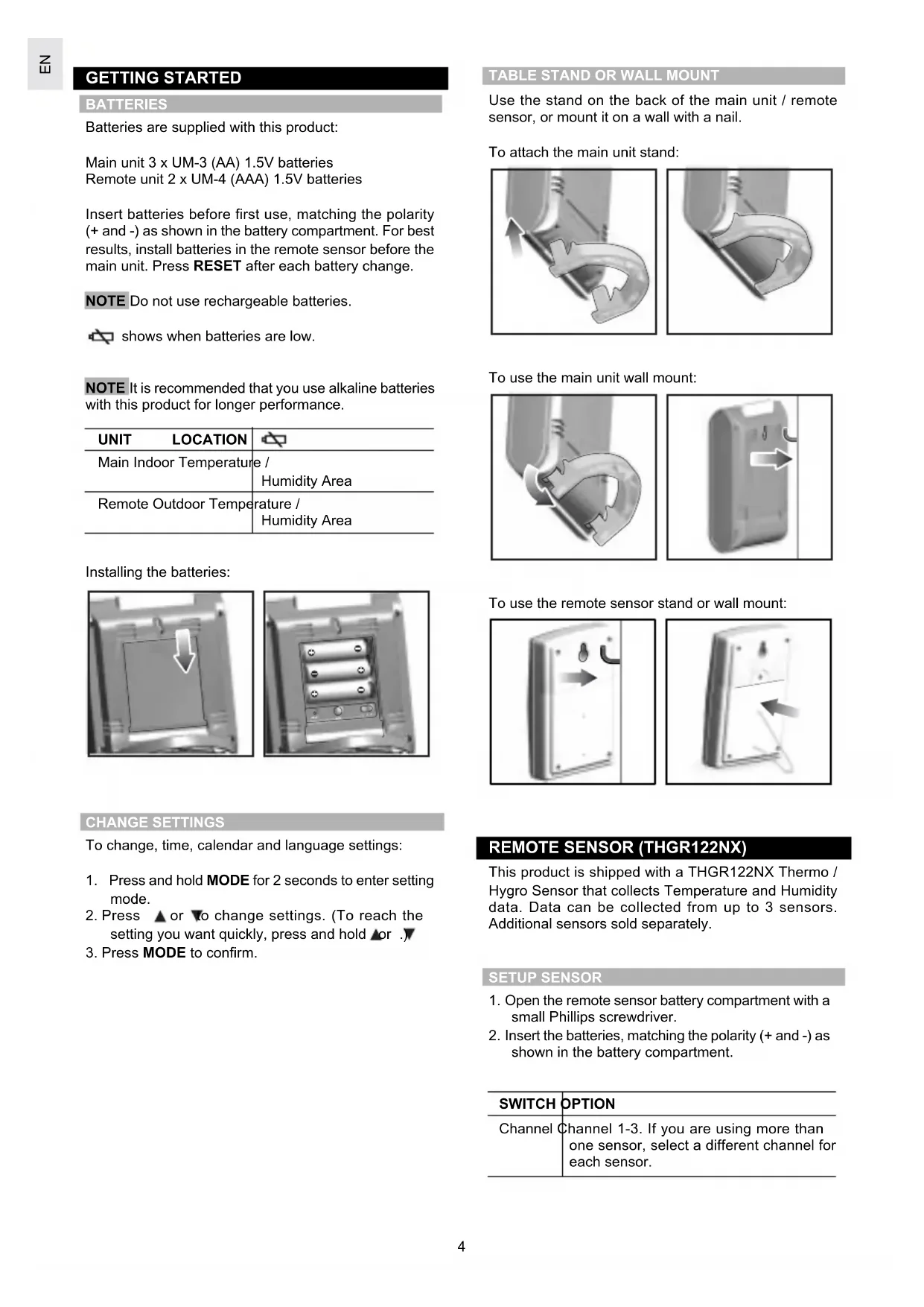 shown in the battery compartment. SWITCH OPTION Channel Channel 1-3. If you are using more than one sensor, select a different channel for each sensor. GETTING STARTED BATTERIES Batteries are supplied with this product: Main unit 3 x UM-3 (AA) 1.5V batteries Remote unit 2 x UM-4 (AAA) 1.5V batteries Insert batteries before first use, matching the polarity (+ and -) as shown in the battery compartment. For best results, install batteries in the remote sensor before the main unit. Press RESET after each battery change. NOTE Do not use rechargeable batteries. shows when batteries are low. NOTE It is recommended that you use alkaline batteries with this product for longer performance. UNIT LOCATION Main Indoor Temperature / Humidity Area Remote Outdoor Temperature / Humidity Area Installing the batteries: CHANGE SETTINGS To change, time, calendar and language settings: