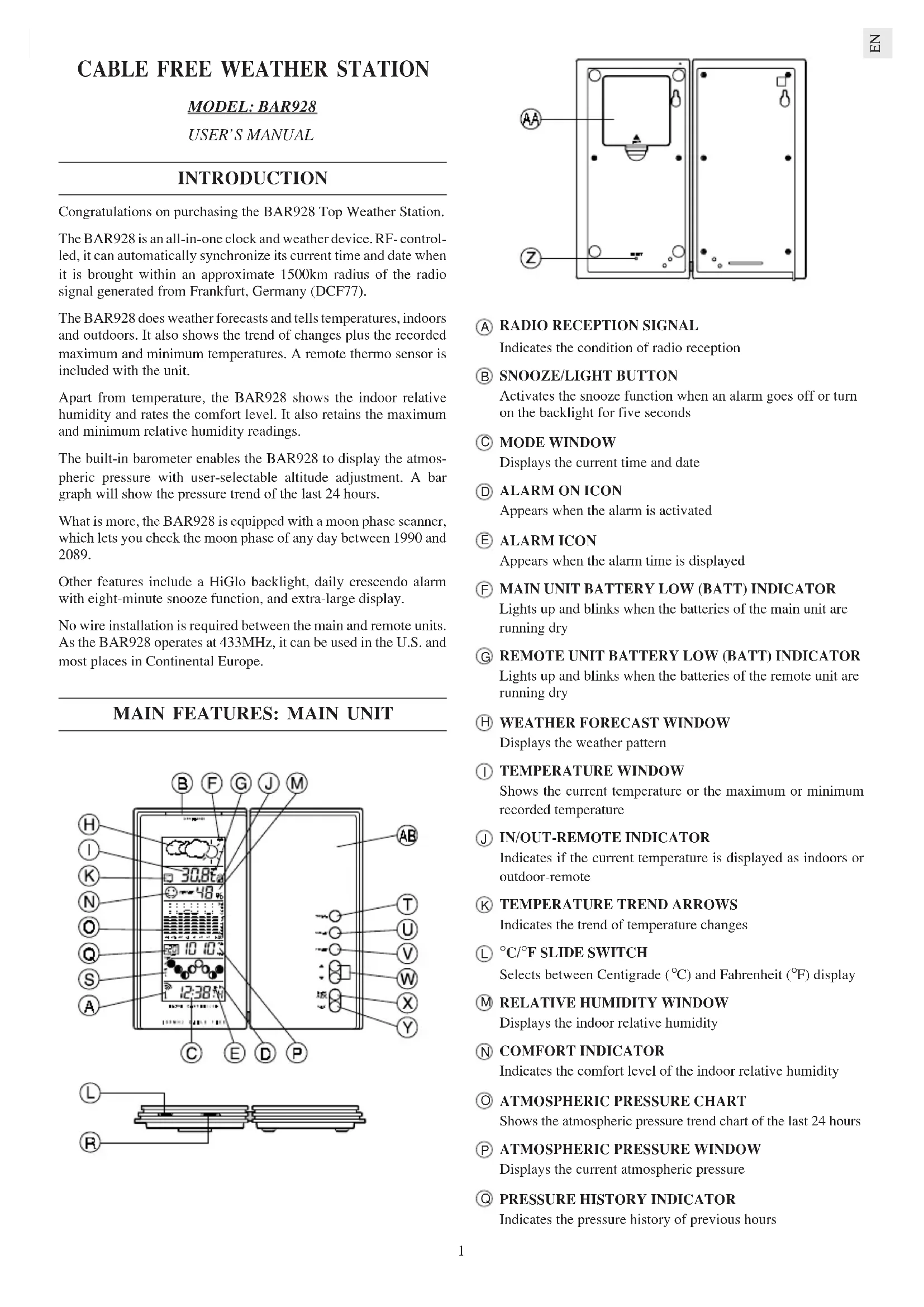 INTRODUCTION Congratulations on purchasing the BAR928 Top Weather Station. The BAR928 is an all-in-one clock and weather device. RF- control- led, it can automatically synchronize its current time and date when it is brought within an approximate 1500km radius of the radio signal generated from Frankfurt, Germany (DCF77). The BAR928 does weather forecasts and tells temperatures, indoors and outdoors. It also shows the trend of changes plus the recorded maximum and minimum temperatures. A remote thermo sensor is included with the unit. Apart from temperature, the BAR928 shows the indoor relative humidity and rates the comfort level. It also retains the maximum and minimum relative humidity readings. The built-in barometer enables the BAR928 to display the atmos- pheric pressure with user-selectable altitude adjustment. A bar graph will show the pressure trend of the last 24 hours. What is more, the BAR928 is equipped with a moon phase scanner, which lets you check the moon phase of any day between 1990 and