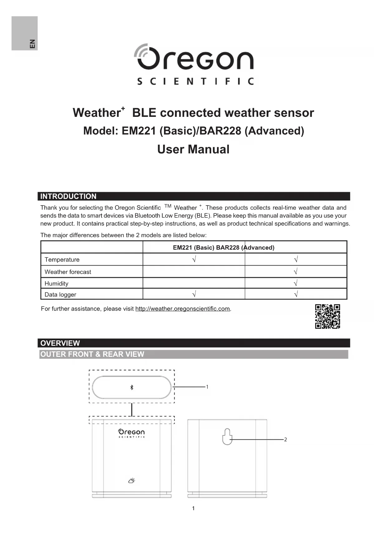. These products collects real-time weather data and sends the data to smart devices via Bluetooth Low Energy (BLE). Please keep this manual available as you use your new product. It contains practical step-by-step instructions, as well as product technical specications and warnings. The major differences between the 2 models are listed below: EM221 (Basic) BAR228 (Advanced) Temperature