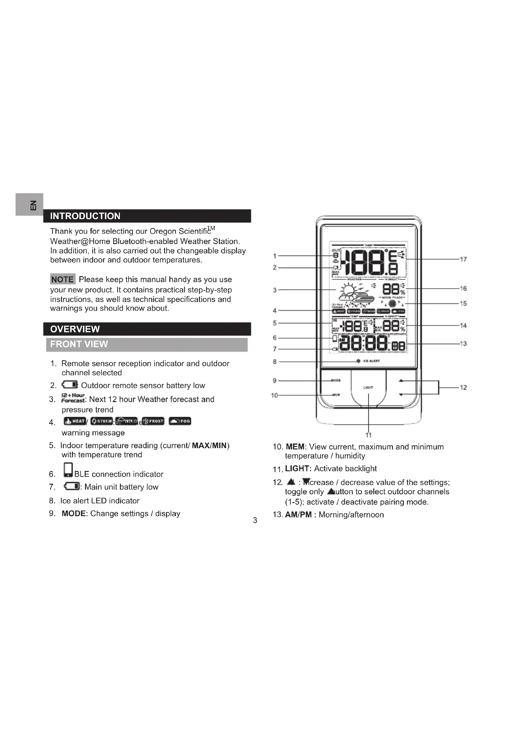 Weather@Home Bluetooth-enabled Weather Station. In addition, it is also carried out the changeable display between indoor and outdoor temperatures. NOTE Please keep this manual handy as you use your new product. It contains practical step-by-step instructions, as well as technical specications and warnings you should know about. OVERVIEW FRONT VIEW