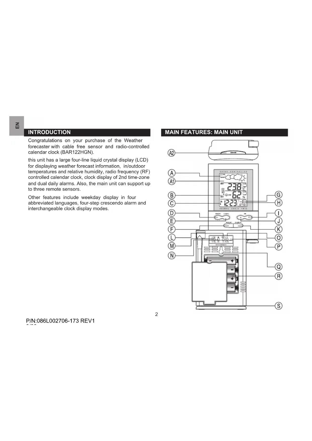 INTRODUCTION Congratulations on your purchase of the Weather forecaster with cable free sensor and radio-controlled calendar clock (BAR122HGN). this unit has a large four-line liquid crystal display (LCD) for displaying weather forecast information, in/outdoor temperatures and relative humidity, radio frequency (RF) controlled calendar clock, clock display of 2nd time-zone and dual daily alarms. Also, the main unit can support up to three remote sensors. Other features include weekday display in four abbreviated languages, four-step crescendo alarm and interchangeable clock display modes.