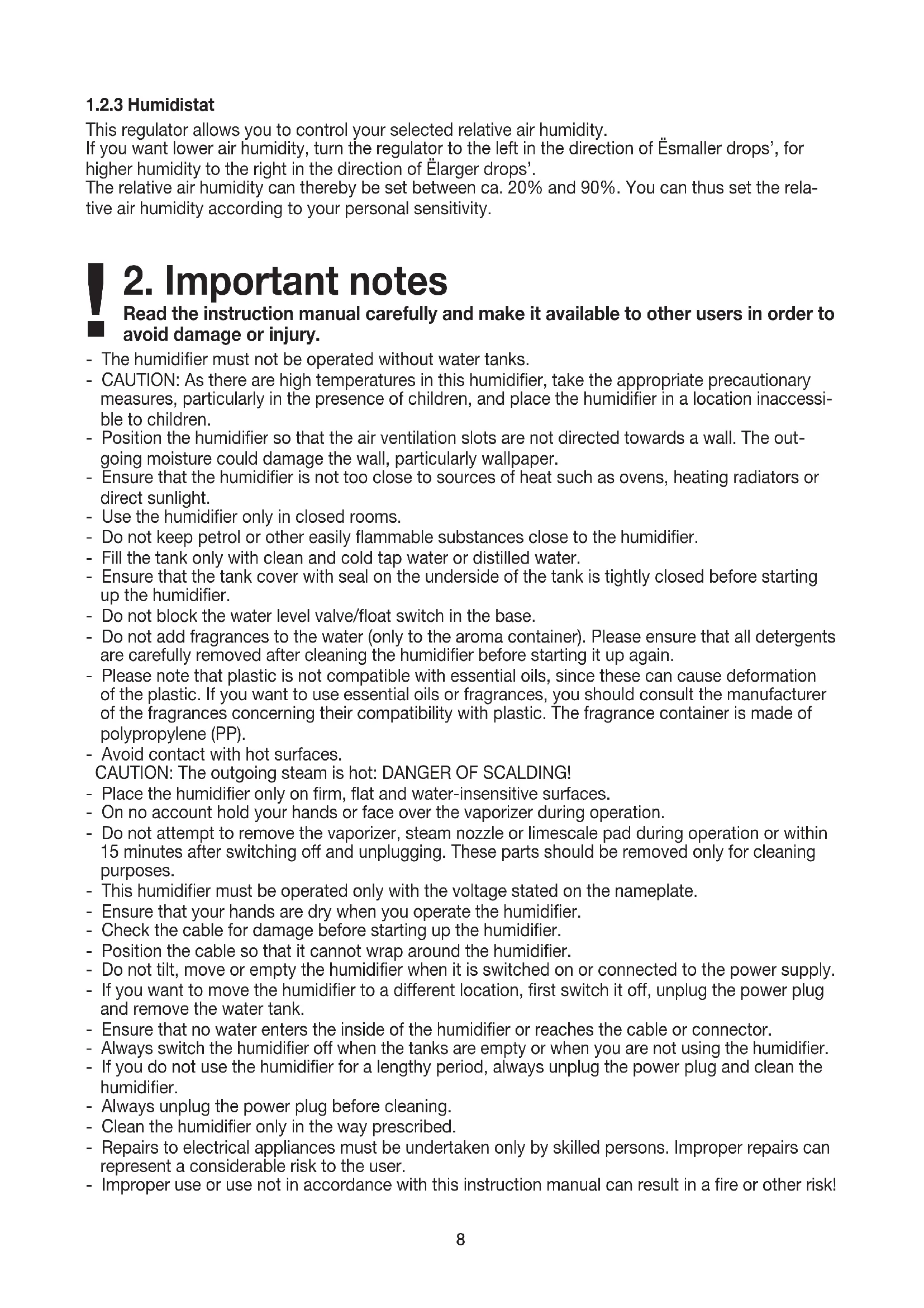 going moisture could damage the wall, particularly wallpaper. - Ensure that the humidifier is not too close to sources of heat such as ovens, heating radiators or direct sunlight. - Use the humidifier only in closed rooms. - Do not keep petrol or other easily flammable substances close to the humidifier. - Fill the tank only with clean and cold tap water or distilled water. - Ensure that the tank cover with seal on the underside of the tank is tightly closed before starting up the humidifier. - Do not block the water level valve/float switch in the base. - Do not add fragrances to the water (only to the aroma container). Please ensure that all detergents are carefully removed after cleaning the humidifier before starting it up again. - Please note that plastic is not compatible with essential oils, since these can cause deformation of the plastic. If you want to use essential oils or fragrances, you should consult the manufacturer of the fragrances concerning their compatibility with plastic. The fragrance container is made of polypropylene (PP). - Avoid contact with hot surfaces. CAUTION: The outgoing steam is hot: DANGER OF SCALDING! - Place the humidifier only on firm, flat and water-insensitive surfaces. - On no account hold your hands or face over the vaporizer during operation. - Do not attempt to remove the vaporizer, steam nozzle or limescale pad during operation or within 15 minutes after switching off and unplugging. These parts should be removed only for cleaning purposes. - This humidifier must be operated only with the voltage stated on the nameplate. - Ensure that your hands are dry when you operate the humidifier. - Check the cable for damage before starting up the humidifier. - Position the cable so that it cannot wrap around the humidifier. - Do not tilt, move or empty the humidifier when it is switched on or connected to the power supply. - If you want to move the humidifier to a different location, first switch it off, unplug the power plug and remove the water tank. - Ensure that no water enters the inside of the humidifier or reaches the cable or connector. - Always switch the humidifier off when the tanks are empty or when you are not using the humidifier. - If you do not use the humidifier for a lengthy period, always unplug the power plug and clean the humidifier. - Always unplug the power plug before cleaning. - Clean the humidifier only in the way prescribed. - Repairs to electrical appliances must be undertaken only by skilled persons. Improper repairs can represent a considerable risk to the user. - Improper use or use not in accordance with this instruction manual can result in a fire or other risk!