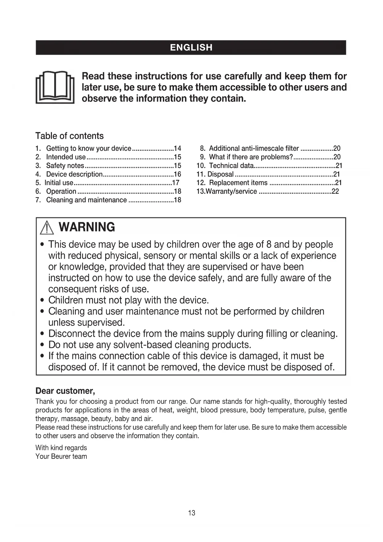 f the mains connection cable of this device is damaged, it must be disposed of. If it cannot be removed, the device must be disposed of. Dear customer, Thank you for choosing a product from our range. Our name stands for high-quality, thoroughly tested products for applications in the areas of heat, weight, blood pressure, body temperature, pulse, gentle therapy, massage, beauty, baby and air. Please read these instructions for use carefully and keep them for later use. Be sure to make them accessible to other users and observe the information they contain. With kind regards Your Beurer team