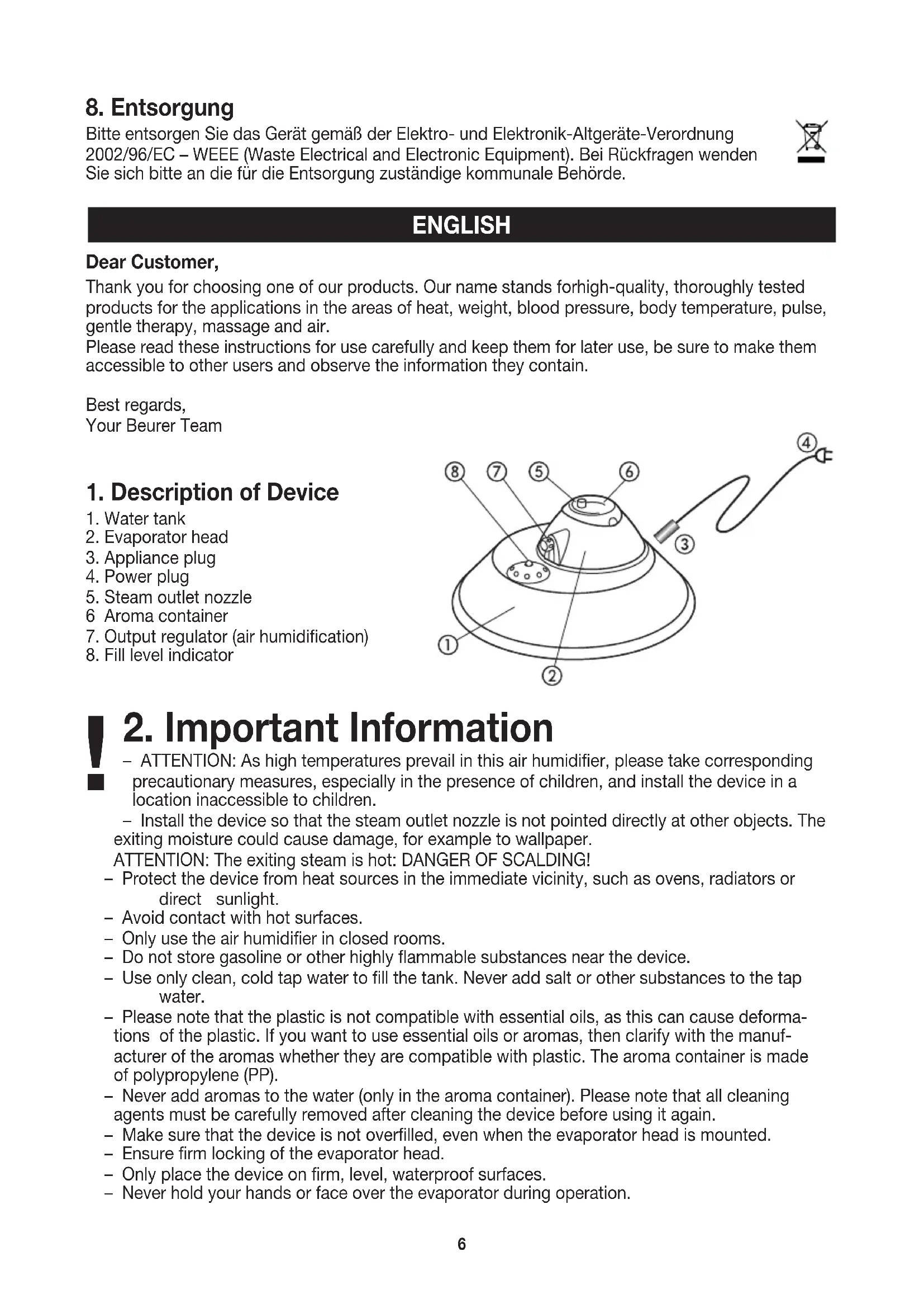 – ATTENTION: As high temperatures prevail in this air humidifier, please take corresponding precautionary measures, especially in the presence of children, and install the device in a location inaccessible to children. – Install the device so that the steam outlet nozzle is not pointed directly at other objects. The exiting moisture could cause damage, for example to wallpaper. ATTENTION: The exiting steam is hot: DANGER OF SCALDING! – Protect the device from heat sources in the immediate vicinity, such as ovens, radiators or direct sunlight. – Avoid contact with hot surfaces. – Only use the air humidifier in closed rooms. – Do not store gasoline or other highly flammable substances near the device. – Use only clean, cold tap water to fill the tank. Never add salt or other substances to the tap water. – Please note that the plastic is not compatible with essential oils, as this can cause deforma- tions of the plastic. If you want to use essential oils or aromas, then clarify with the manuf- acturer of the aromas whether they are compatible with plastic. The aroma container is made of polypropylene (PP). – Never add aromas to the water (only in the aroma container). Please note that all cleaning agents must be carefully removed after cleaning the device before using it again. – Make sure that the device is not overfilled, even when the evaporator head is mounted. – Ensure firm locking of the evaporator head. – Only place the device on firm, level, waterproof surfaces. – Never hold your hands or face over the evaporator during operation. ENGLISH