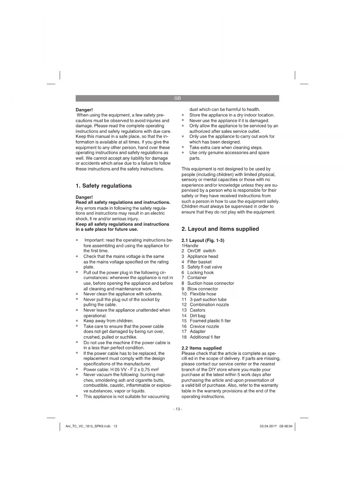 Please check that the article is complete as spe- cifi ed in the scope of delivery. If parts are missing, please contact our service center or the nearest branch of the DIY store where you made your purchase at the latest within 5 work days after purchasing the article and upon presentation of a valid bill of purchase. Also, refer to the warranty table in the warranty provisions at the end of the operating instructions. Anl_TC_VC_1815_SPK9.indb 13Anl_TC_VC_1815_SPK9.indb 13 03.04.2017 08:48:0403.04.2017 08:48:04GB