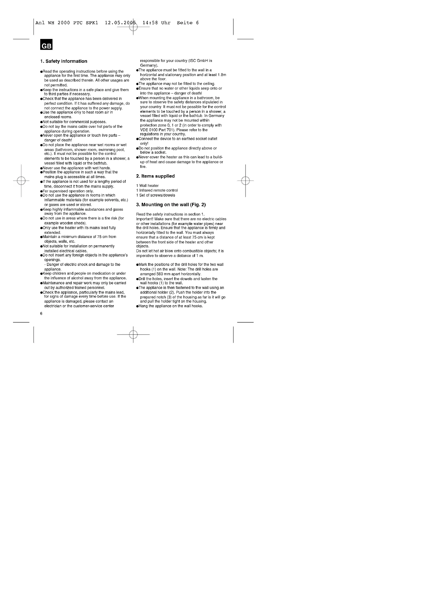Read the safety instructions in section 1. Important! Make sure that there are no electric cables or other installations (for example water pipes) near the drill holes. Ensure that the appliance is firmly and horizontally fitted to the wall. You must always ensure that a distance of at least 75 cm is kept between the front side of the heater and other objects. Do not let hot air blow onto combustible objects; it is imperative to observe a distance of 1 m. 앬 Mark the positions of the drill holes for the two wall hooks (1) on the wall. Note: The drill holes are arranged 560 mm apart horizontally. 앬 Drill the holes, insert the dowels and fasten the wall hooks (1) to the wall. 앬 The appliance is then fastened to the wall using an additional holder (2). Push the holder into the prepared notch (3) of the housing as far is it will go and pull the holder tight on the housing. 앬 Hang the appliance on the wall hooks. Anl WH 2000 PTC SPK1 12.05.2005 14:58 Uhr Seite 67