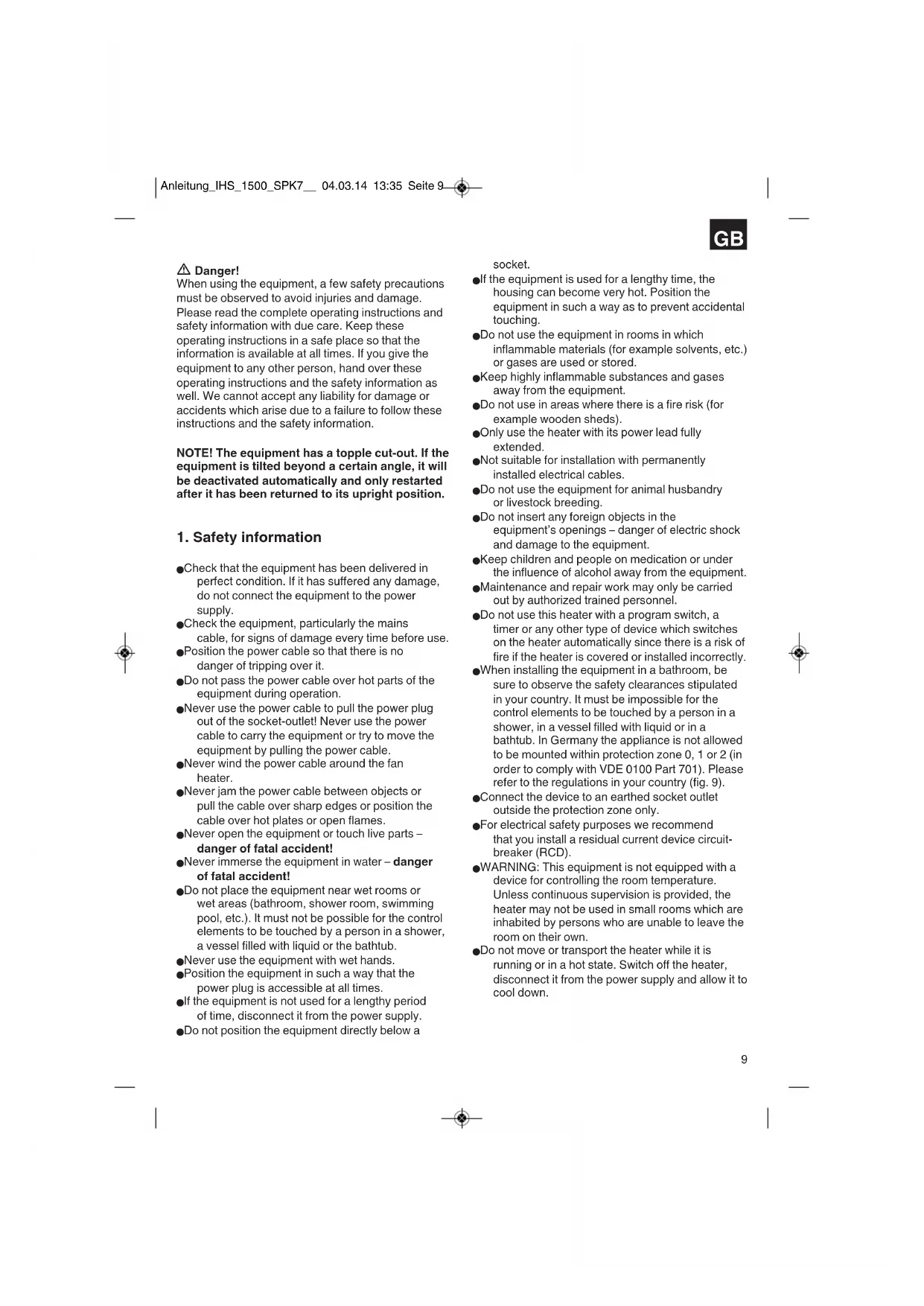 Anleitung_IHS_1500_SPK7__ 04.03.14 13:35 Seite 9Important: The heater will remain hot for several minutes after it has been deactivated. n Do not adjust under any circumstances the angle of swivel during operation. Risk of burns! Let the equipment cool down! n Children younger than 3 years must be kept away unless they are continuously supervised n Children of 3 years and younger than 8 years are allowed to use the equipment only if they are supervised or have received instruction in how to use the equipment safely and understand the dangers which result from such use, provided that the equipment is positioned or installed in its normal place of use. Children of 3 years and younger than 8 years are not allowed to insert the plug into the socket, regulate the equipment, clean the equipment and/or perform the maintenance which a user is expected to perform. n Caution – Some parts of the product can become very hot and cause burns. Special care is required when children and persons in need of protection are present. n Important: LED radiation! Avoid eye damage! The equipment uses Class 1 LEDs. Do not direct the LED beam into the eyes of any persons or animals!