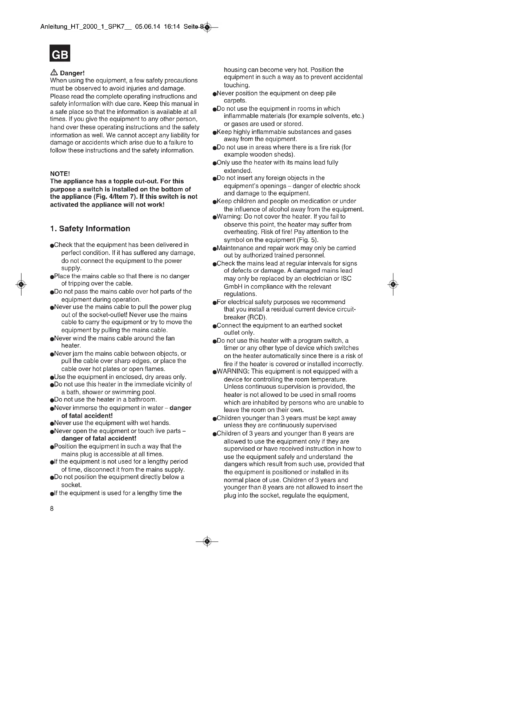 Anleitung_HT_2000_1_SPK7__ 05.06.14 16:14 Seite 8clean the equipment and/or perform the maintenance which a user is expected to perform. n Caution – Some parts of the product can become very hot and cause burns. Special care is required when children and persons in need of protection are present. Danger! Read all safety regulations and instructions. Any errors made in following the safety regulations and instructions may result in an electric shock, fire and/or serious injury. Keep all safety regulations and instructions in a safe place for future use.
