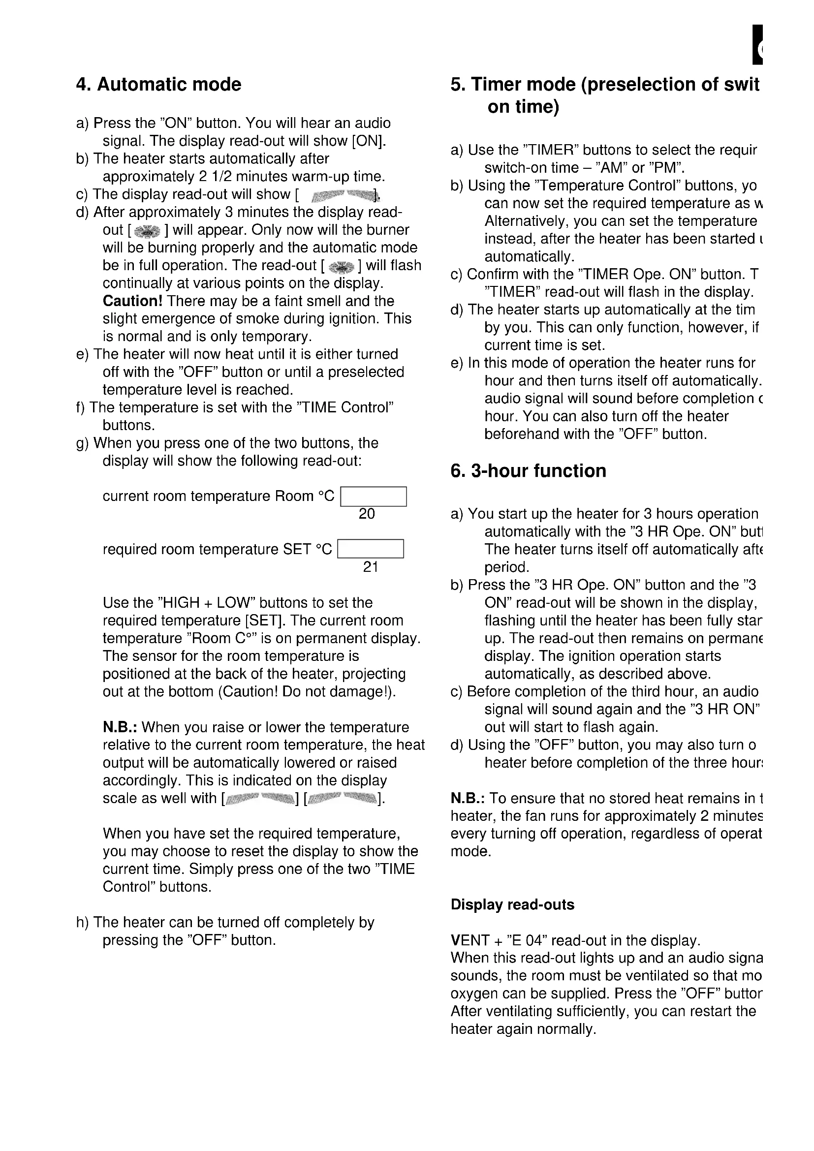 Fuel displa (refill) Timer function on Operating mode display 3-hour function Current room temperature Heat output display Automatic mod display4. Automatic mode a) Press the ”ON” button. You will hear an audio signal. The display read-out will show [ON]. b) The heater starts automatically after approximately 2 1/2 minutes warm-up time. c) The display read-out will show [ ]. d) After approximately 3 minutes the display read- out [ ] will appear. Only now will the burner will be burning properly and the automatic mode be in full operation. The read-out [ ] will flash continually at various points on the display. Caution! There may be a faint smell and the slight emergence of smoke during ignition. This is normal and is only temporary. e) The heater will now heat until it is either turned off with the ”OFF” button or until a preselected temperature level is reached. f) The temperature is set with the ”TIME Control” buttons. g) When you press one of the two buttons, the display will show the following read-out: current room temperature Room °C