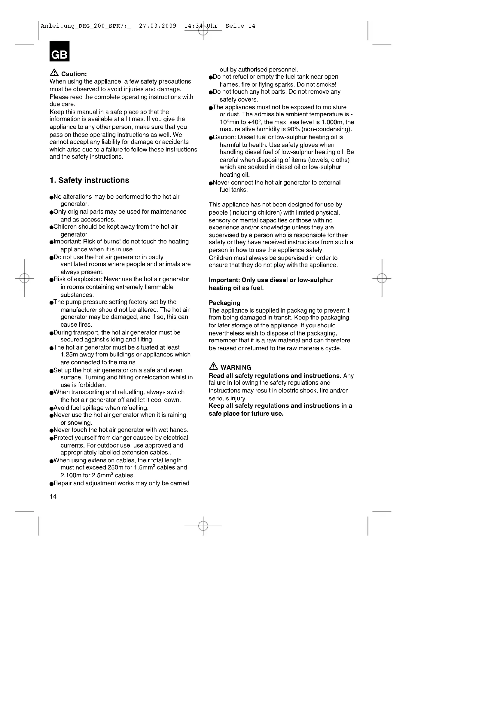 No alterations may be performed to the hot air generator. Only original parts may be used for maintenance and as accessories. Children should be kept away from the hot air generator Important: Risk of burns! do not touch the heating appliance when it is in use Do not use the hot air generator in badly ventilated rooms where people and animals are always present. Risk of explosion: Never use the hot air generator in rooms containing extremely flammable substances. The pump pressure setting factory-set by the manufacturer should not be altered. The hot air generator may be damaged, and if so, this can cause fires. During transport, the hot air generator must be secured against sliding and tilting. The hot air generator must be situated at least 1.25m away from buildings or appliances which are connected to the mains. Set up the hot air generator on a safe and even surface. Turning and tilting or relocation whilst in use is forbidden. When transporting and refuelling, always switch the hot air generator off and let it cool down. Avoid fuel spillage when refuelling. Never use the hot air generator when it is raining or snowing. Never touch the hot air generator with wet hands. Protect yourself from danger caused by electrical currents. For outdoor use, use approved and appropriately labelled extension cables.. When using extension cables, their total length must not exceed 250m for 1.5mm² cables and 2,100m for 2.5mm² cables. Repair and adjustment works may only be carried out by authorised personnel. Do not refuel or empty the fuel tank near open flames, fire or flying sparks. Do not smoke! Do not touch any hot parts. Do not remove any safety covers. The appliances must not be exposed to moisture or dust. The admissible ambient temperature is - 10°min to +40°, the max. sea level is 1,000m, the max. relative humidity is 90% (non-condensing). Caution: Diesel fuel or low-sulphur heating oil is harmful to health. Use safety gloves when handling diesel fuel of low-sulphur heating oil. Be careful when disposing of items (towels, cloths) which are soaked in diesel oil or low-sulphur heating oil. Never connect the hot air generator to external fuel tanks. This appliance has not been designed for use by people (including children) with limited physical, sensory or mental capacities or those with no experience and/or knowledge unless they are supervised by a person who is responsible for their safety or they have received instructions from such a person in how to use the appliance safely. Children must always be supervised in order to ensure that they do not play with the appliance. Important: Only use diesel or low-sulphur heating oil as fuel. Packaging The appliance is supplied in packaging to prevent it from being damaged in transit. Keep the packaging for later storage of the appliance. If you should nevertheless wish to dispose of the packaging, remember that it is a raw material and can therefore be reused or returned to the raw materials cycle. WARNING Read all safety regulations and instructions. Any failure in following the safety regulations and instructions may result in electric shock, fire and/or serious injury. Keep all safety regulations and instructions in a safe place for future use.
