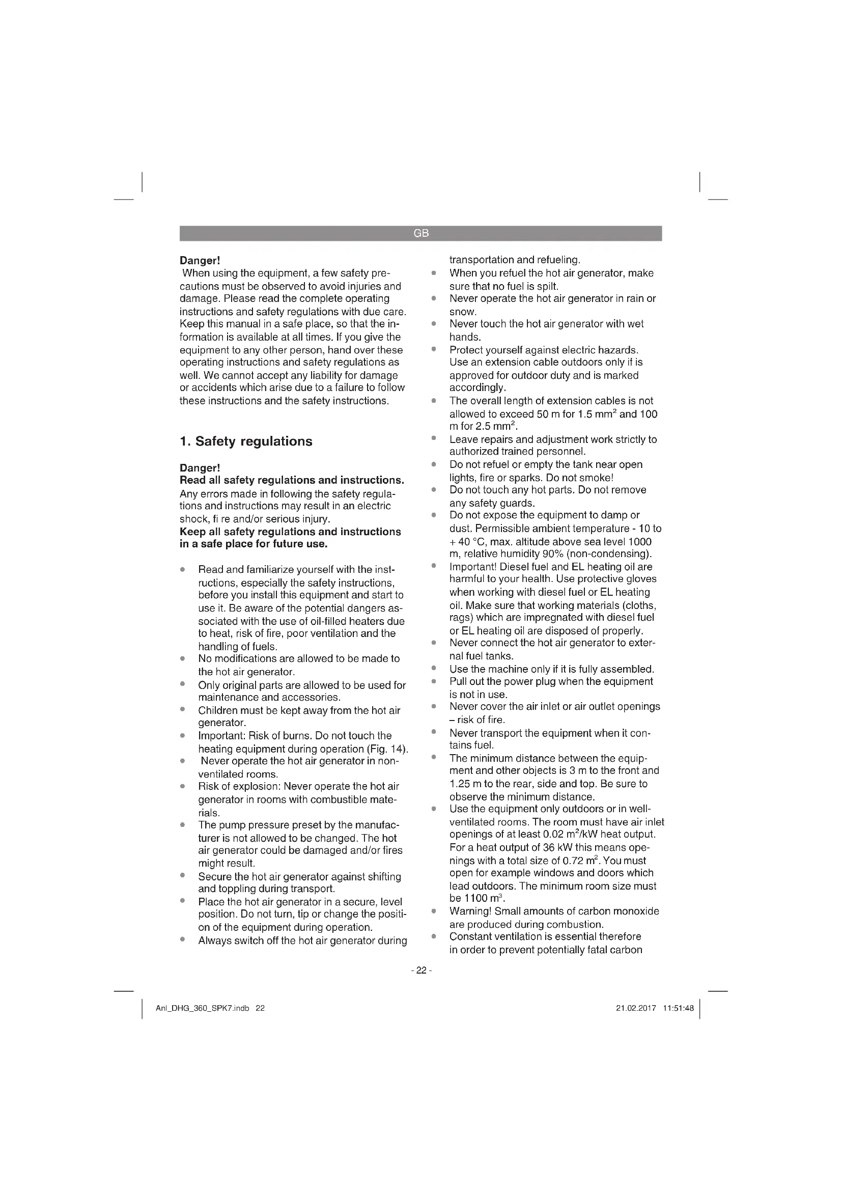 The transportable hot air generator, which is powered by EL heating oil or diesel fuel, is ideal for heating and drying well ventilated enclosed spaces (e.g. tents, storage facilities, building Anl_DHG_360_SPK7.indb 23Anl_DHG_360_SPK7.indb 23 21.02.2017 11:51:4921.02.2017 11:51:49GB