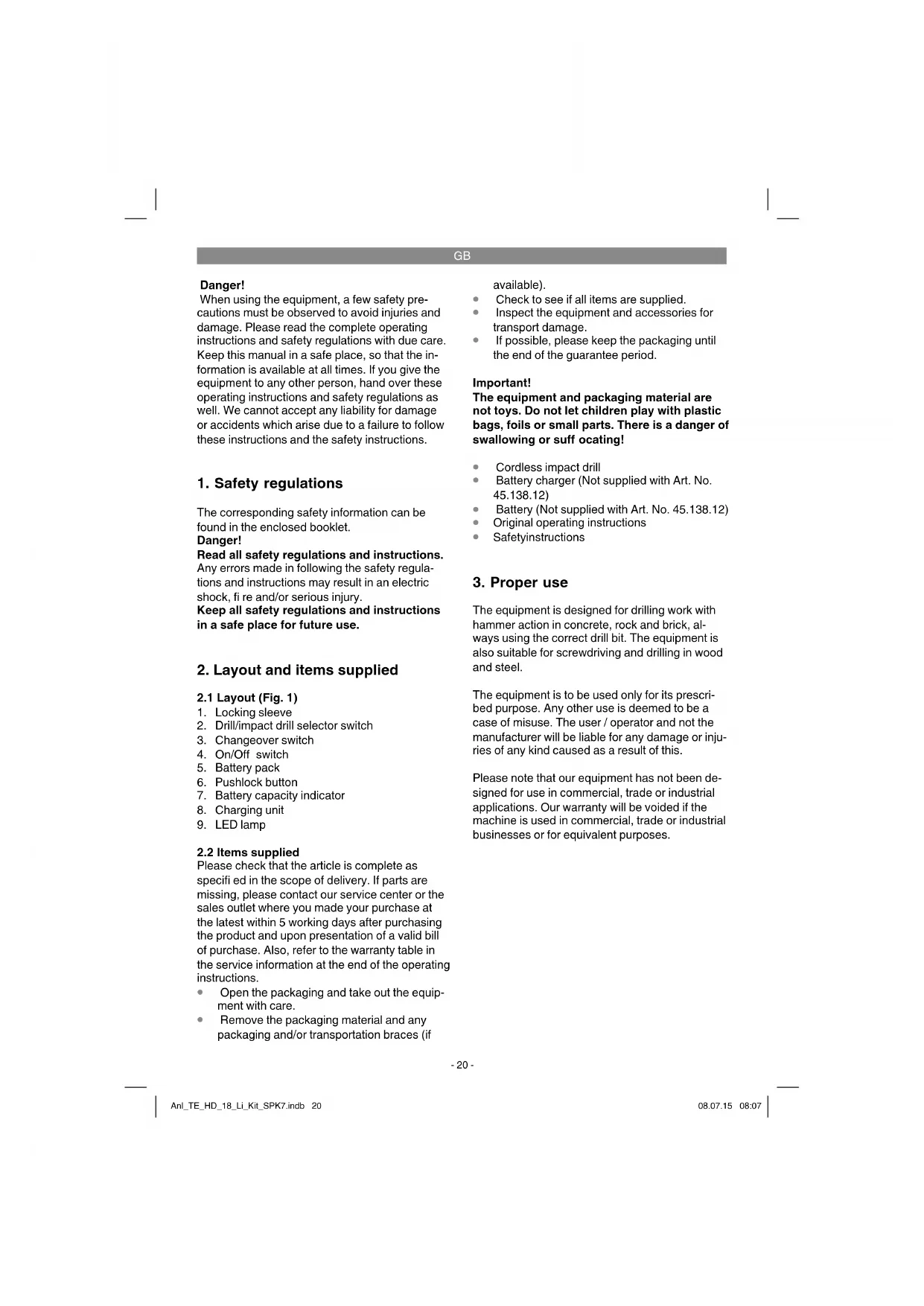 The equipment is designed for drilling work with hammer action in concrete, rock and brick, al- ways using the correct drill bit. The equipment is also suitable for screwdriving and drilling in wood and steel. The equipment is to be used only for its prescri- bed purpose. Any other use is deemed to be a case of misuse. The user / operator and not the manufacturer will be liable for any damage or inju- ries of any kind caused as a result of this. Please note that our equipment has not been de- signed for use in commercial, trade or industrial applications. Our warranty will be voided if the machine is used in commercial, trade or industrial businesses or for equivalent purposes. Anl_TE_HD_18_Li_Kit_SPK7.indb 20Anl_TE_HD_18_Li_Kit_SPK7.indb 20 08.07.15 08:0708.07.15 08:07GB