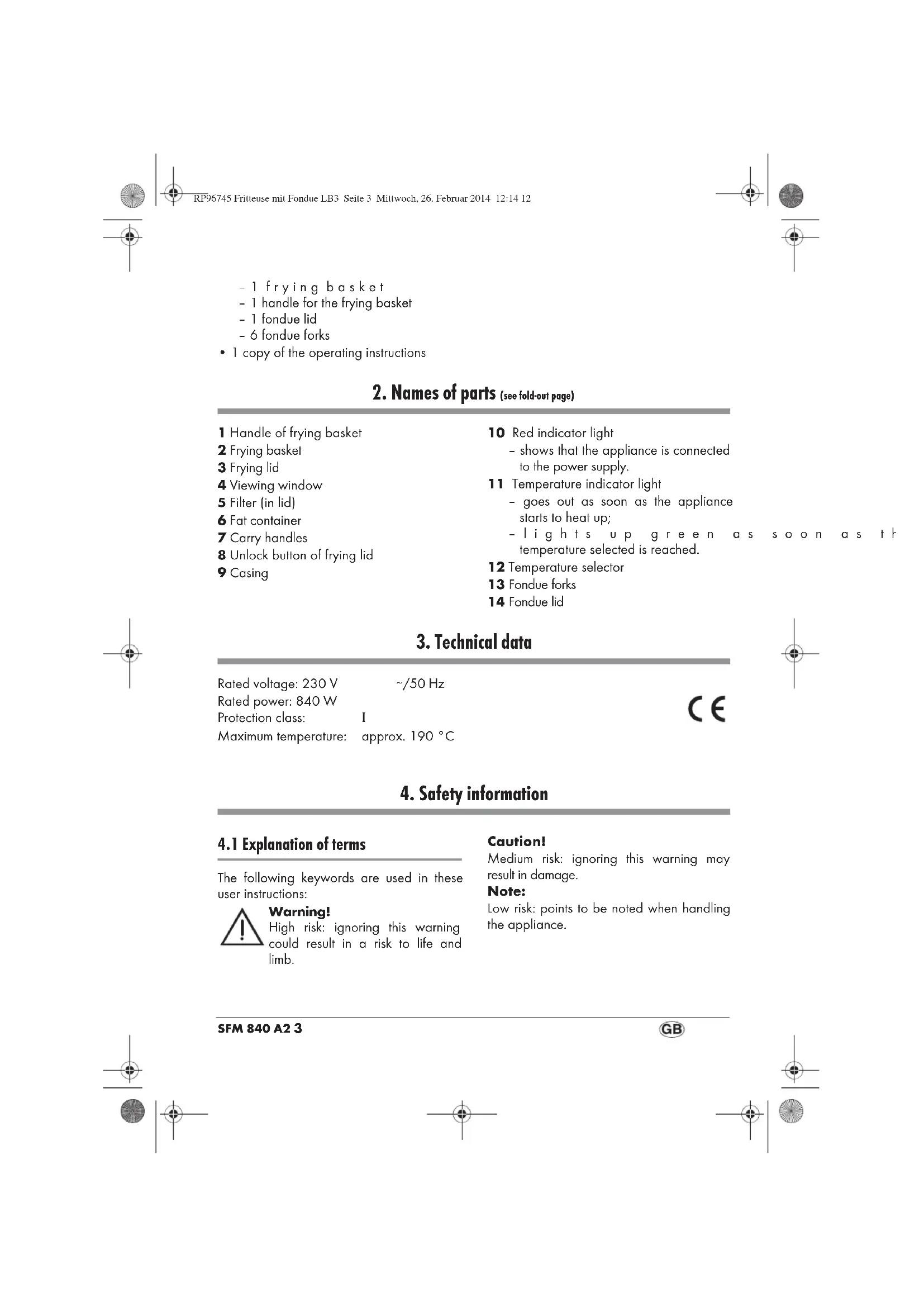 The following keywords are used in these user instructions: Warning! High risk: ignoring this warning could result in a risk to life and limb. Caution! Medium risk: ignoring this warning may result in damage. Note: Low risk: points to be noted when handling the appliance. RP96745 Fritteuse mit Fondue LB3 Seite 3 Mittwoch, 26. Februar 2014 12:14 124
