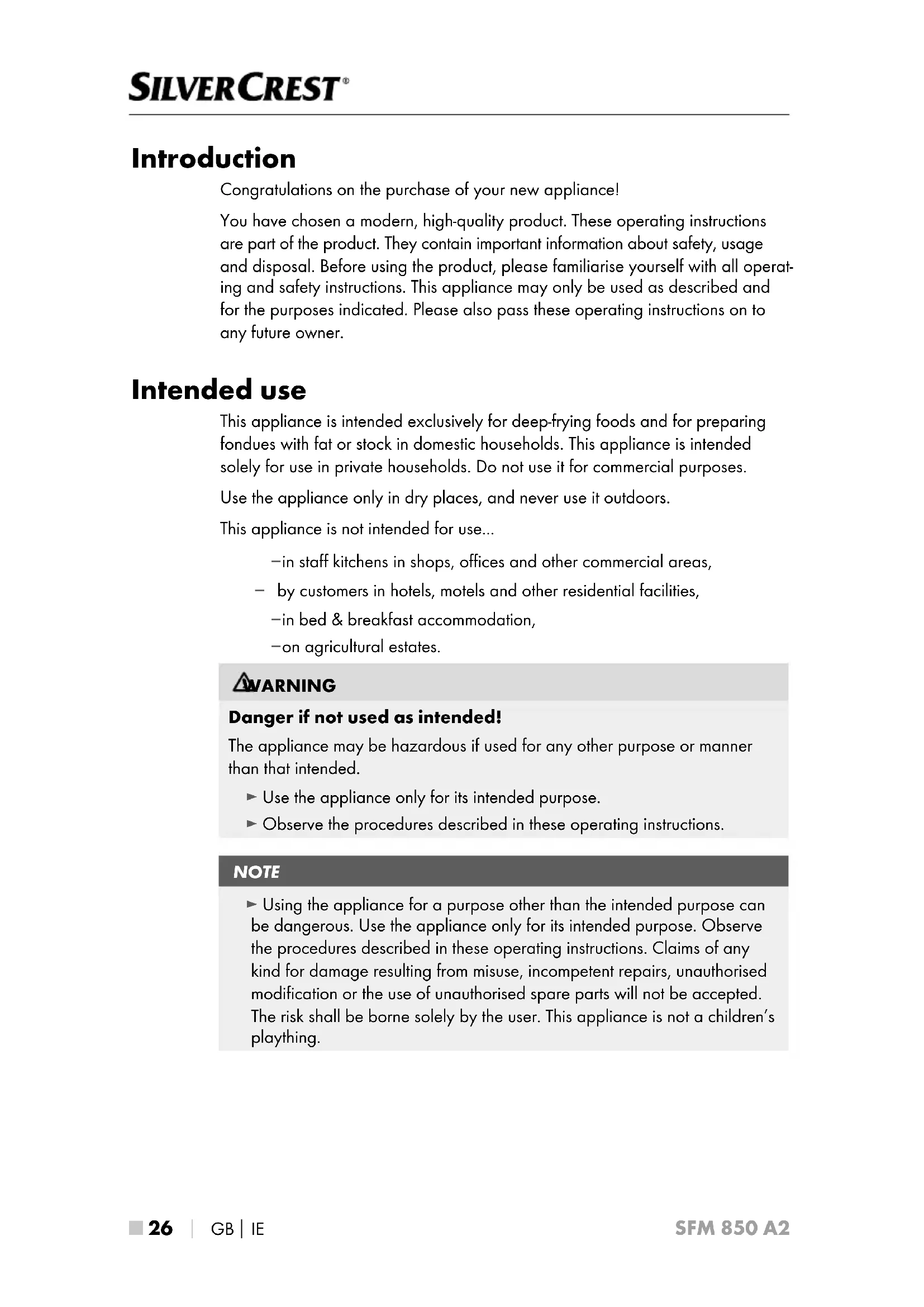 SFM 850 A2 Introduction Congratulations on the purchase of your new appliance! You have chosen a modern, high-quality product. These operating instructions are part of the product. They contain important information about safety, usage and disposal. Before using the product, please familiarise yourself with all operat- ing and safety instructions. This appliance may only be used as described and for the purposes indicated. Please also pass these operating instructions on to any future owner. Intended use This appliance is intended exclusively for deep-frying foods and for preparing fondues with fat or stock in domestic households. This appliance is intended solely for use in private households. Do not use it for commercial purposes. Use the appliance only in dry places, and never use it outdoors. This appliance is not intended for use... – in staff kitchens in shops, offices and other commercial areas, – by customers in hotels, motels and other residential facilities, – in bed & breakfast accommodation, – on agricultural estates. WARNING Danger if not used as intended! The appliance may be hazardous if used for any other purpose or manner than that intended. ► Use the appliance only for its intended purpose. ► Observe the procedures described in these operating instructions. NOTE ► Using the appliance for a purpose other than the intended purpose can be dangerous. Use the appliance only for its intended purpose. Observe the procedures described in these operating instructions. Claims of any kind for damage resulting from misuse, incompetent repairs, unauthorised modification or the use of unauthorised spare parts will not be accepted. The risk shall be borne solely by the user. This appliance is not a children’s plaything.GB