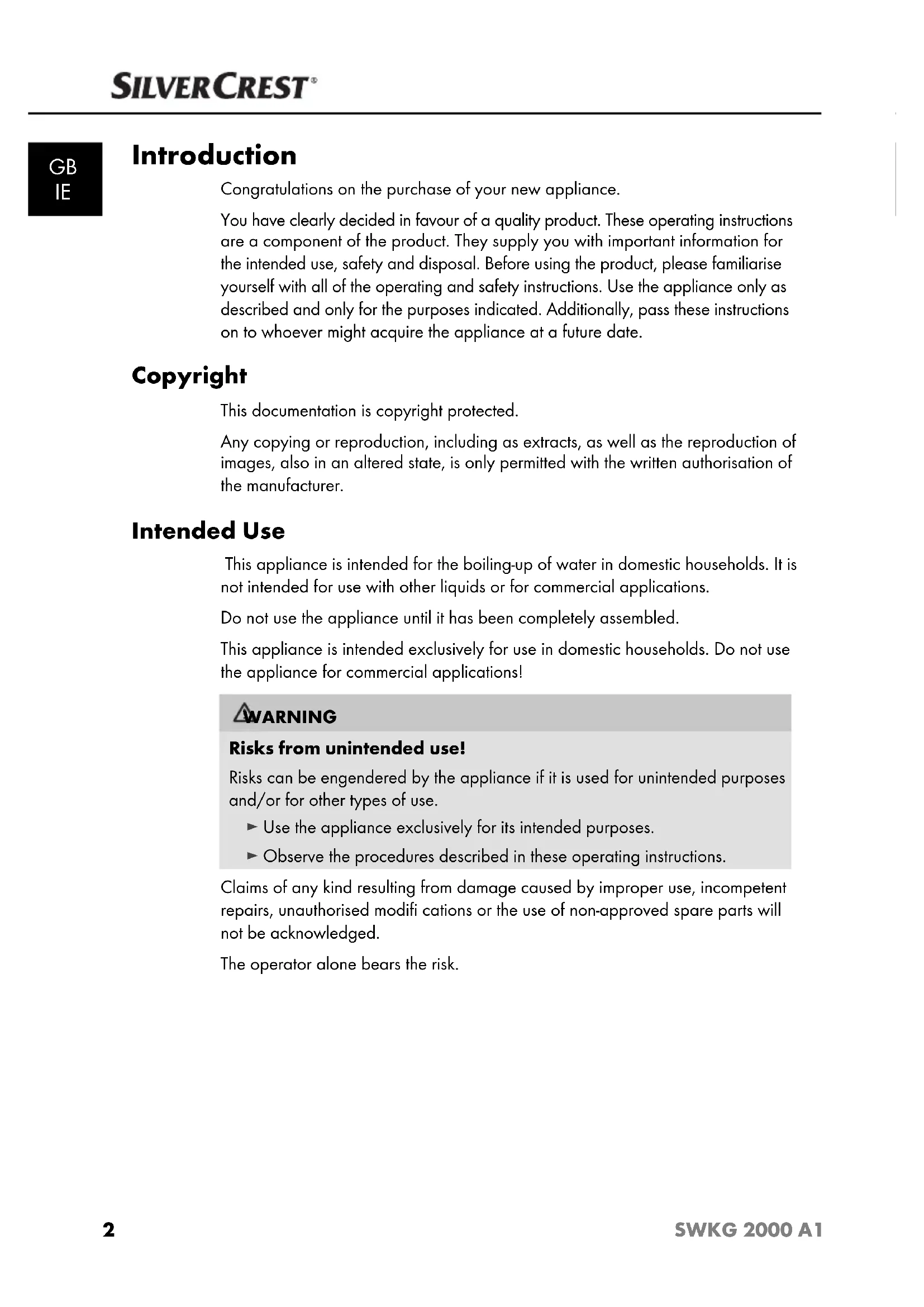 Introduction Congratulations on the purchase of your new appliance. You have clearly decided in favour of a quality product. These operating instructions are a component of the product. They supply you with important information for the intended use, safety and disposal. Before using the product, please familiarise yourself with all of the operating and safety instructions. Use the appliance only as described and only for the purposes indicated. Additionally, pass these instructions on to whoever might acquire the appliance at a future date. Copyright This documentation is copyright protected. Any copying or reproduction, including as extracts, as well as the reproduction of images, also in an altered state, is only permitted with the written authorisation of the manufacturer. Intended Use This appliance is intended for the boiling-up of water in domestic households. It is not intended for use with other liquids or for commercial applications. Do not use the appliance until it has been completely assembled. This appliance is intended exclusively for use in domestic households. Do not use the appliance for commercial applications! WARNING Risks from unintended use! Risks can be engendered by the appliance if it is used for unintended purposes and/or for other types of use. ► Use the appliance exclusively for its intended purposes. ► Observe the procedures described in these operating instructions. Claims of any kind resulting from damage caused by improper use, incompetent repairs, unauthorised modifi cations or the use of non-approved spare parts will not be acknowledged. The operator alone bears the risk. IB_100122_SWKG2000A1_SE_DK_BE_NL.indb 2IB_100122_SWKG2000A1_SE_DK_BE_NL.indb 2 23.04.14 16:3323.04.14 16:333 SWKG 2000 A1