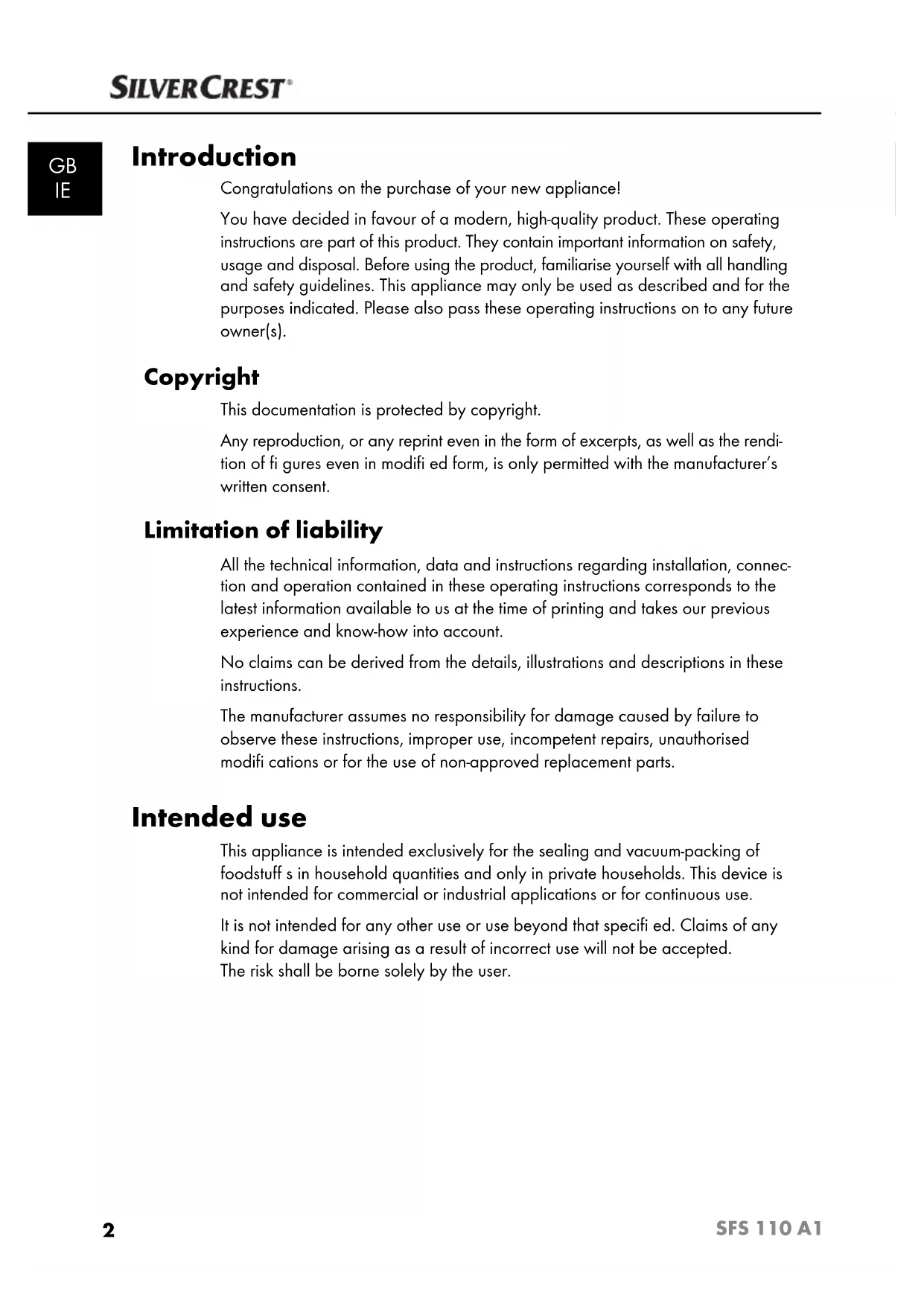 SFS 110 A1 Introduction Congratulations on the purchase of your new appliance! You have decided in favour of a modern, high-quality product. These operating instructions are part of this product. They contain important information on safety, usage and disposal. Before using the product, familiarise yourself with all handling and safety guidelines. This appliance may only be used as described and for the purposes indicated. Please also pass these operating instructions on to any future owner(s). Copyright This documentation is protected by copyright. Any reproduction, or any reprint even in the form of excerpts, as well as the rendi- tion of fi gures even in modifi ed form, is only permitted with the manufacturer’s written consent. Limitation of liability All the technical information, data and instructions regarding installation, connec- tion and operation contained in these operating instructions corresponds to the latest information available to us at the time of printing and takes our previous experience and know-how into account. No claims can be derived from the details, illustrations and descriptions in these instructions. The manufacturer assumes no responsibility for damage caused by failure to observe these instructions, improper use, incompetent repairs, unauthorised modifi cations or for the use of non-approved replacement parts. Intended use This appliance is intended exclusively for the sealing and vacuum-packing of foodstuff s in household quantities and only in private households. This device is not intended for commercial or industrial applications or for continuous use. It is not intended for any other use or use beyond that specifi ed. Claims of any kind for damage arising as a result of incorrect use will not be accepted. The risk shall be borne solely by the user.3