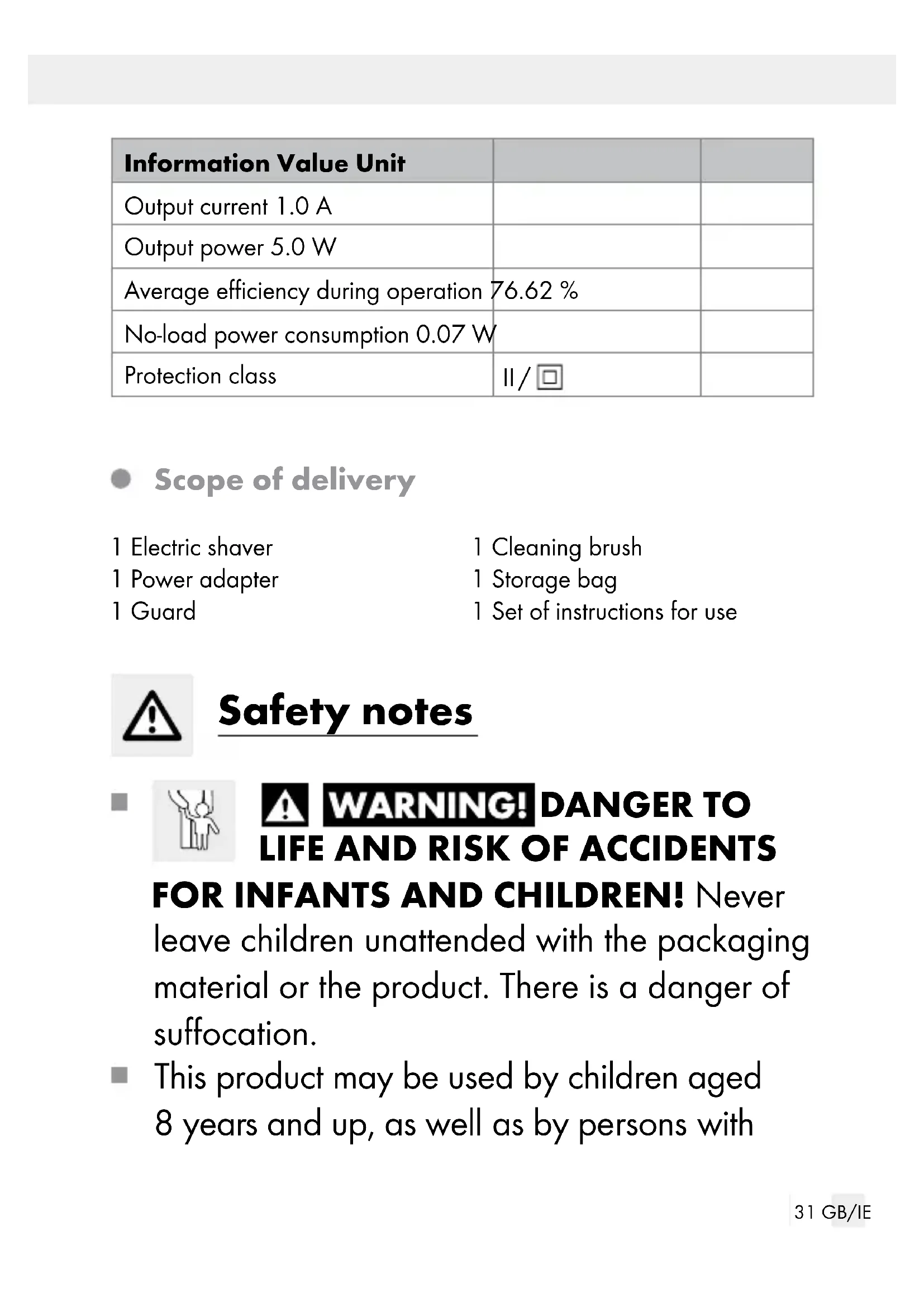 Hair clippers (Fig. H) Technical data Electric shaver: HG06654 Input: 5 V , 1 A Battery: 1 x 3.7 V Li-Ion, 800 mAh Operating temperature: -10 °C to + 40 °C Protection type: IPX6 (Protection against powerful water jets) Only charge the product with the following charger: Information Value Unit Manufacturer name or brand, com- mercial registry number and ad- dress OWIM GmbH & Co. KG Stiftsbergstraße 1 74167 Neckarsulm GERMANY Model code HG07359-VDE Input voltage 100–240 V∼ Input alternating current frequency 50 / 60 Hz Output voltage 5.0 V31 GB/IE Information Value Unit Output current 1.0 A Output power 5.0 W Average efficiency during operation 76.62 % No-load power consumption 0.07 W Protection class II / Scope of delivery 1 Electric shaver 1 Power adapter 1 Guard 1 Cleaning brush 1 Storage bag 1 Set of instructions for use Safety notes DANGER TO