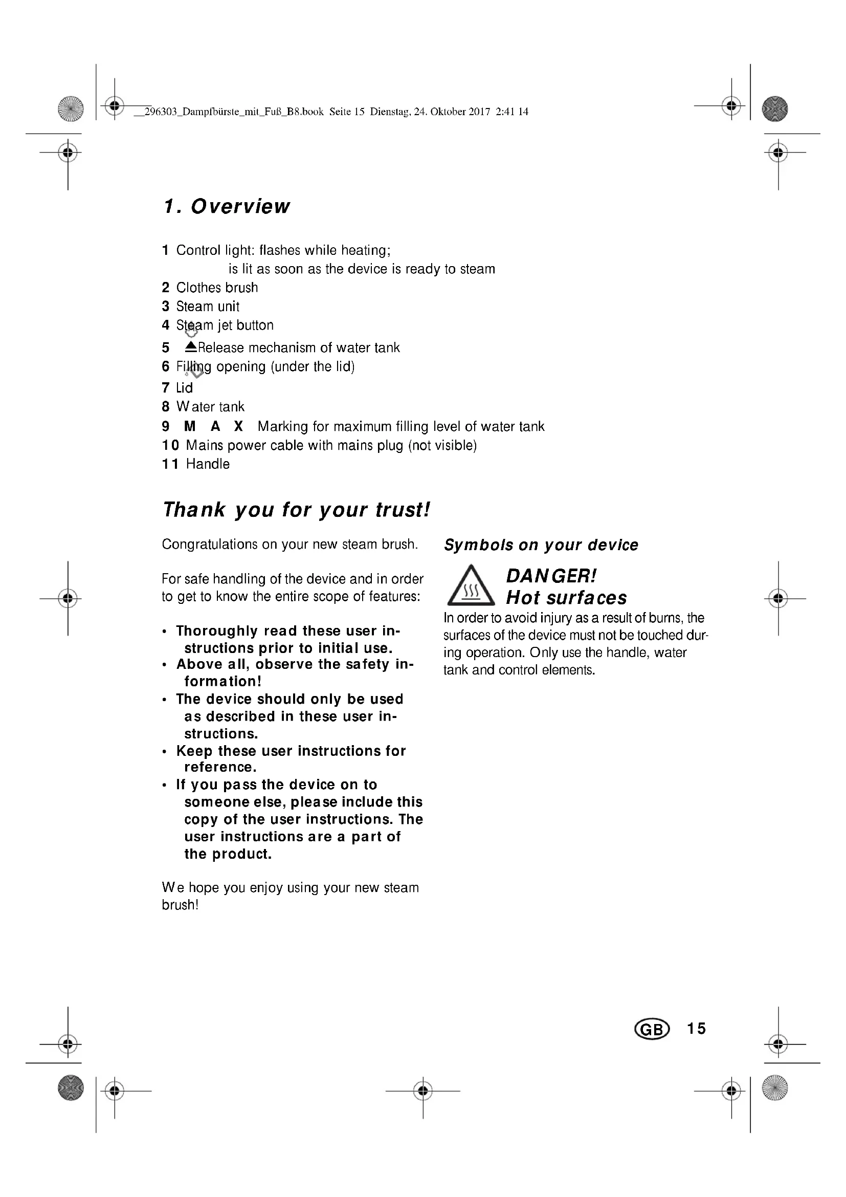 - If you pass the device on to someone else, please include this copy of the user instructions. The user instructions are a part of the product. We hope you enjoy using your new steam brush! Symbols on your device DANGER! Hot surfaces In order to avoid injury as a result of burns, the surfaces of the device must not be touched dur- ing operation. Only use the handle, water tank and control elements. __296303_Dampfbürste_mit_Fuß_B8.book Seite 15 Dienstag, 24. Oktober 2017 2:41 1416