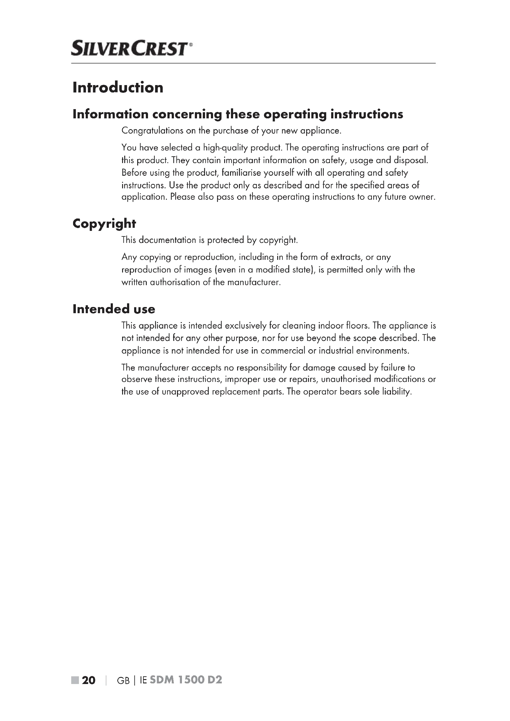 Introduction Information concerning these operating instructions Congratulations on the purchase of your new appliance. You have selected a high-quality product. The operating instructions are part of this product. They contain important information on safety, usage and disposal. Before using the product, familiarise yourself with all operating and safety instructions. Use the product only as described and for the specified areas of application. Please also pass on these operating instructions to any future owner. Copyright This documentation is protected by copyright. Any copying or reproduction, including in the form of extracts, or any reproduction of images (even in a modified state), is permitted only with the written authorisation of the manufacturer. Intended use This appliance is intended exclusively for cleaning indoor floors. The appliance is not intended for any other purpose, nor for use beyond the scope described. The appliance is not intended for use in commercial or industrial environments. The manufacturer accepts no responsibility for damage caused by failure to observe these instructions, improper use or repairs, unauthorised modifications or the use of unapproved replacement parts. The operator bears sole liability.GB