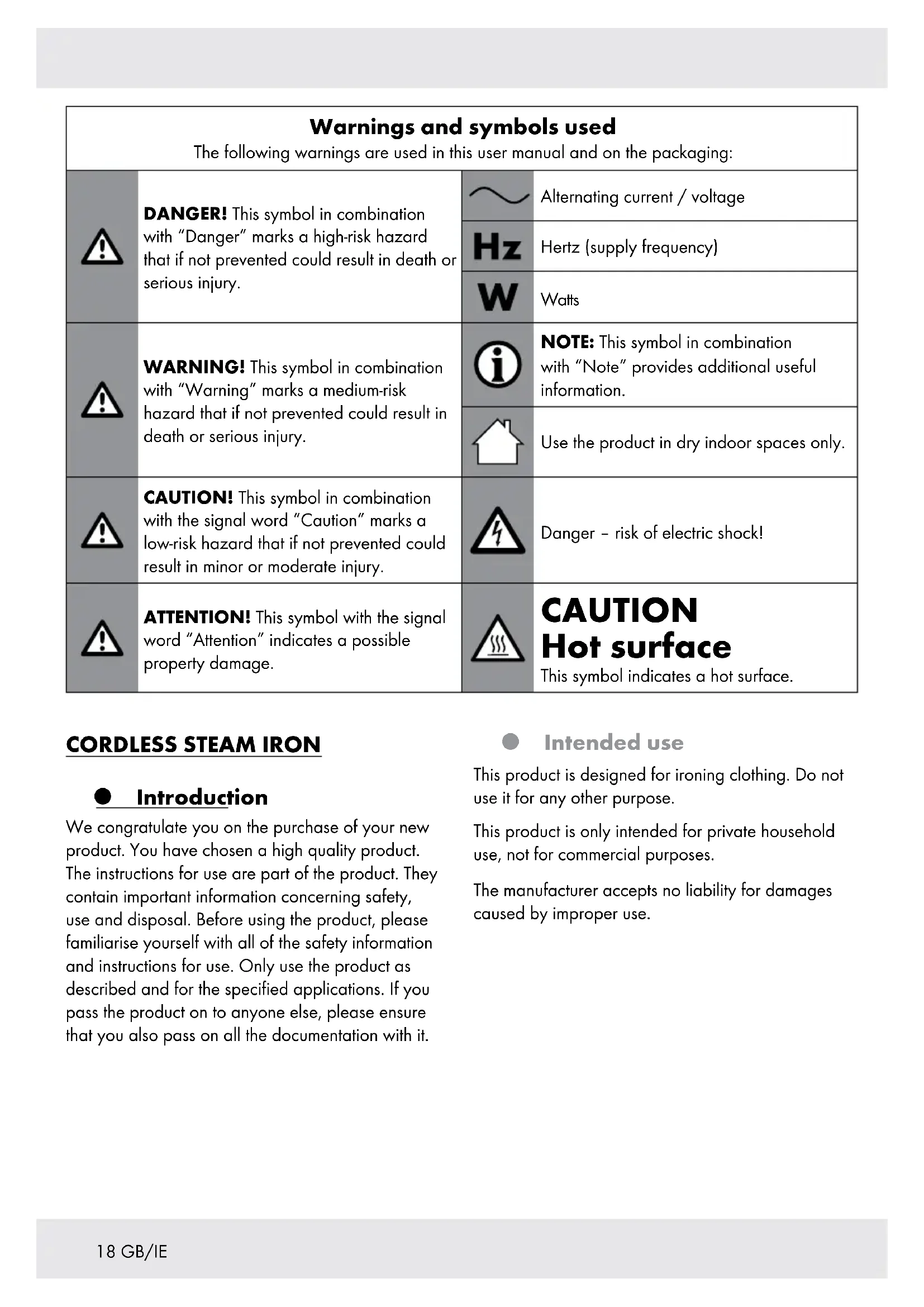 Introduction We congratulate you on the purchase of your new product. You have chosen a high quality product. The instructions for use are part of the product. They contain important information concerning safety, use and disposal. Before using the product, please familiarise yourself with all of the safety information and instructions for use. Only use the product as described and for the specified applications. If you pass the product on to anyone else, please ensure that you also pass on all the documentation with it. Intended use This product is designed for ironing clothing. Do not use it for any other purpose. This product is only intended for private household use, not for commercial purposes. The manufacturer accepts no liability for damages caused by improper use.19GB/IE Scope of delivery After unpacking the product, check if the delivery is complete and if all parts are in good condition. Remove all packaging materials before use. 1x Cordless steam iron 1x Stand base 1x Measuring cup 1x User manual Description of parts [1] Water nozzle [2] Fill opening (water tank) [3] Steam control [4] Spray button [5] Steam burst button [6] Temperature control lamp (heating) [7] Base [8] Power cord (with anti-kink protection and cable clip) and power plug [9] Stand base lock [] Stand base [] Temperature control [] Self-cleaning button [] max mark (max. water fill level 320 ml) [] Soleplate [] Measuring cup (max. water fill level 320 ml) Technical data Input voltage: 220–240 V